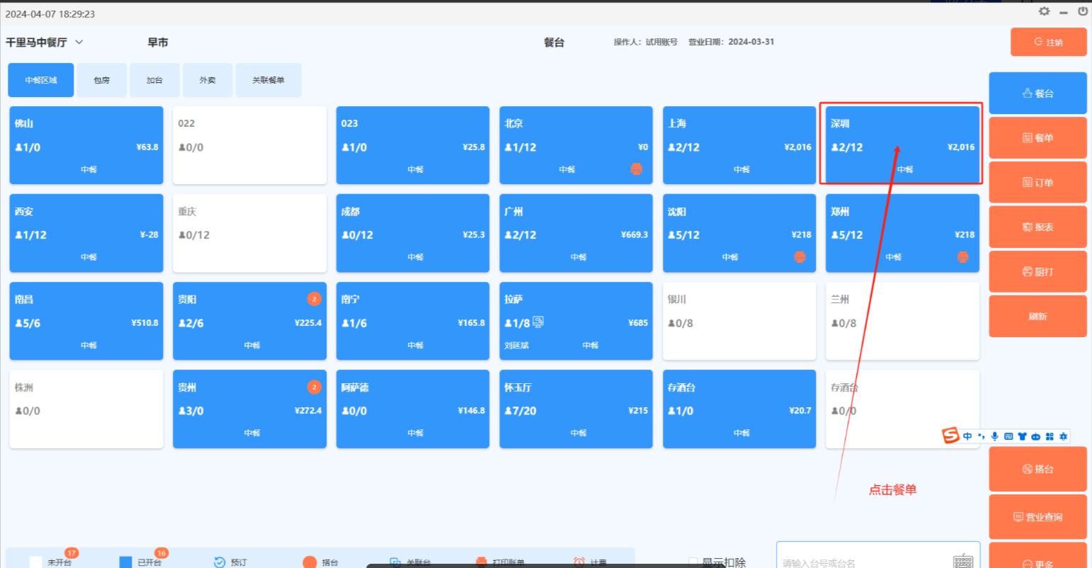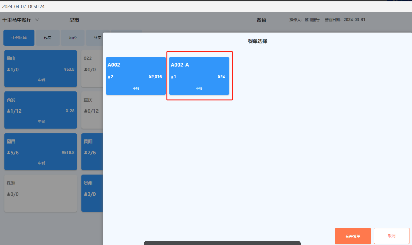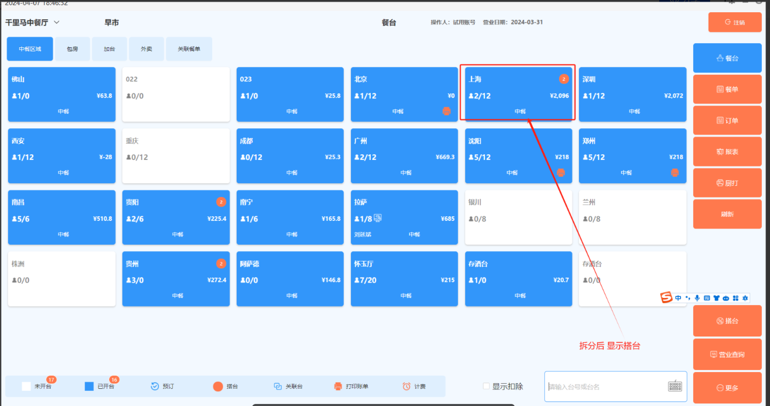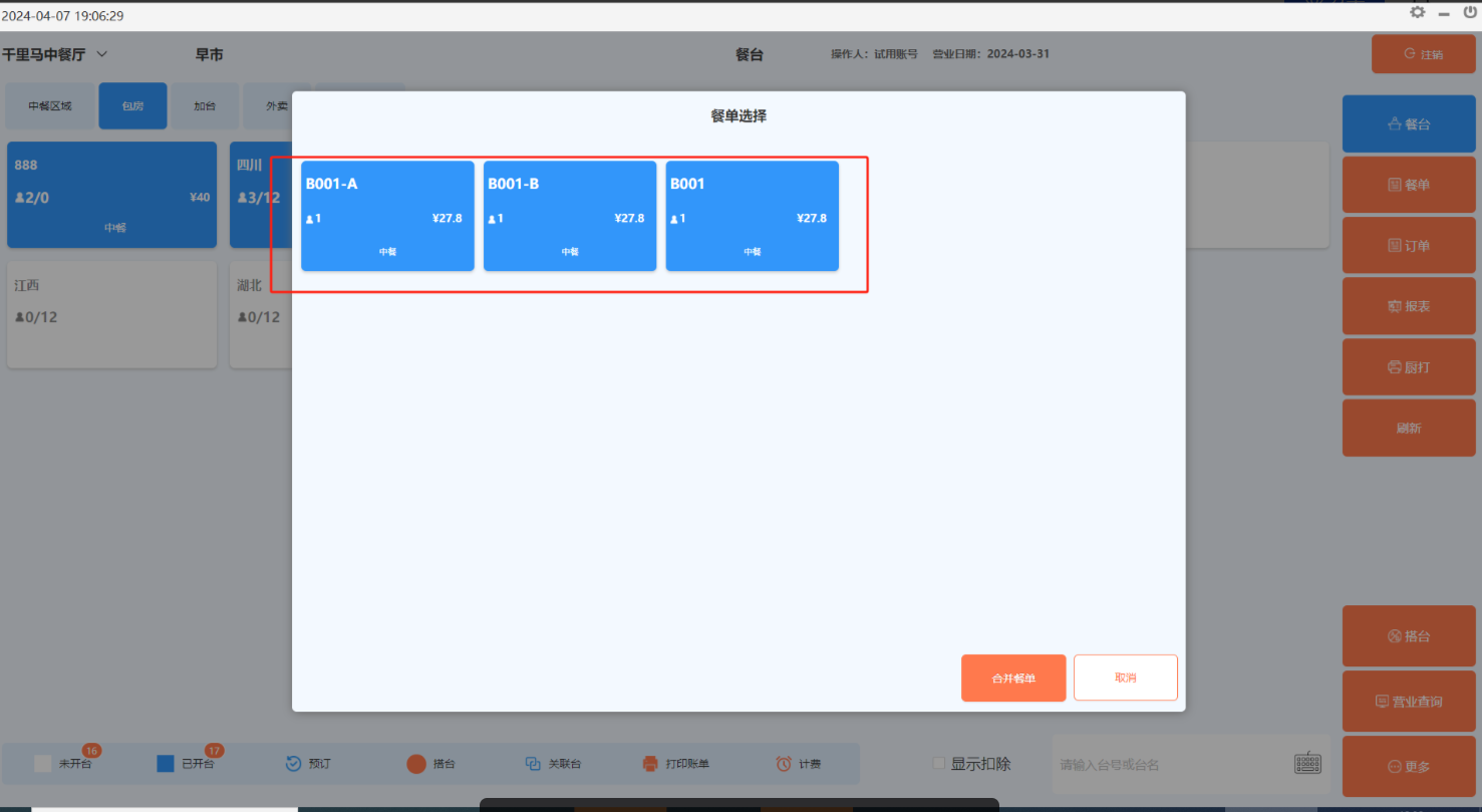 方法一:在台态图的“更多”功能中选择“拆分餐单”,然后选择某张餐单。