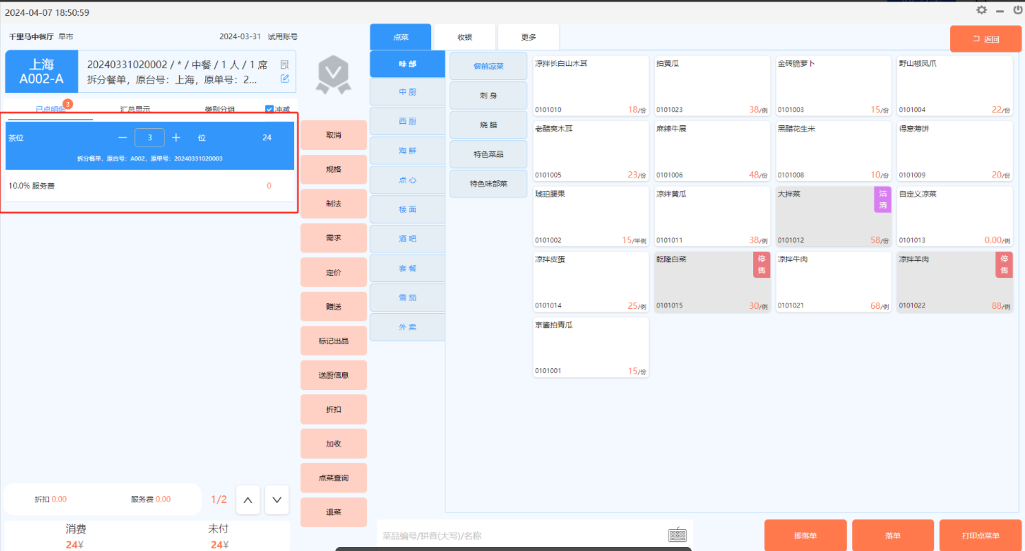 全部拆分:将所选的菜品全部拆分到另一餐单。