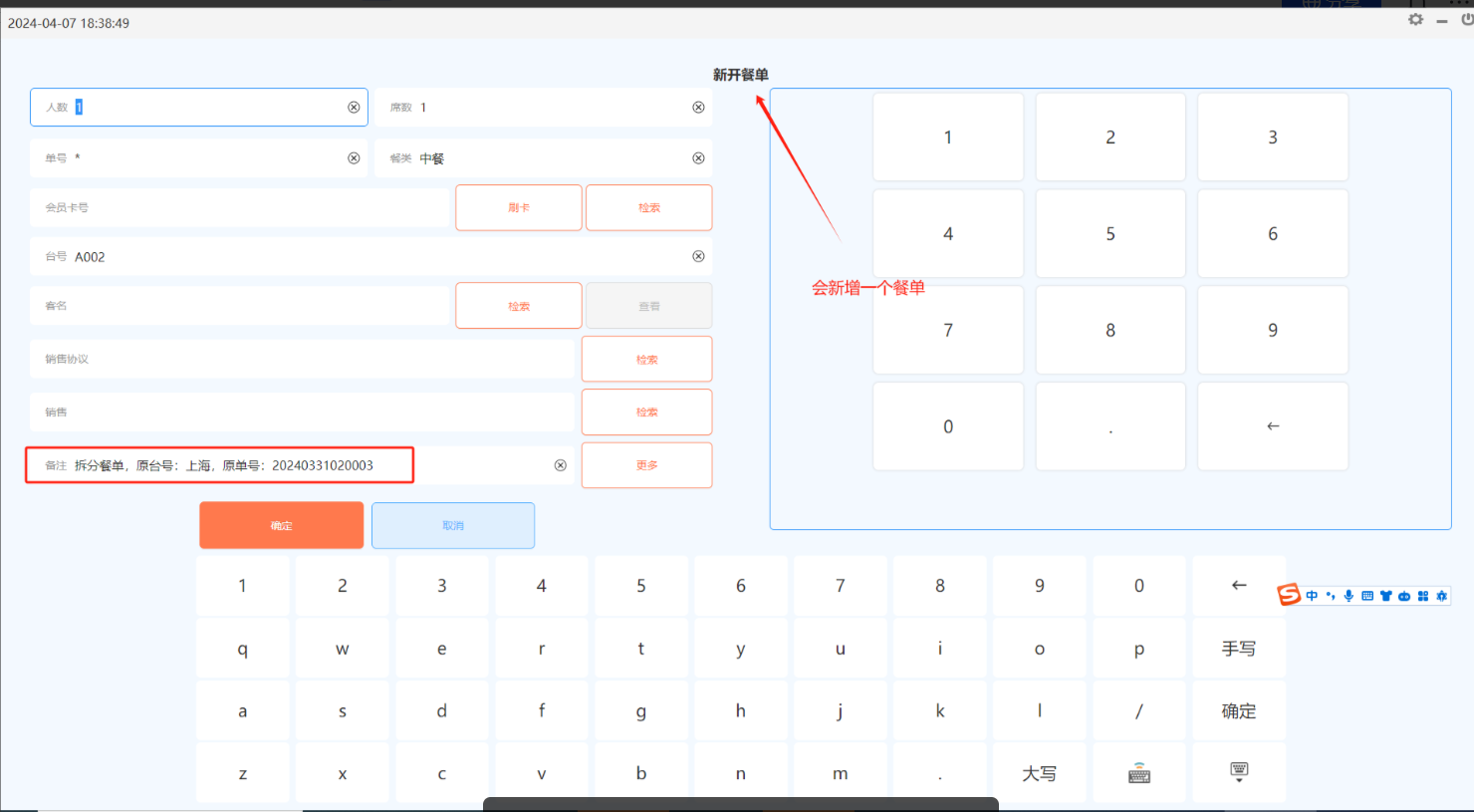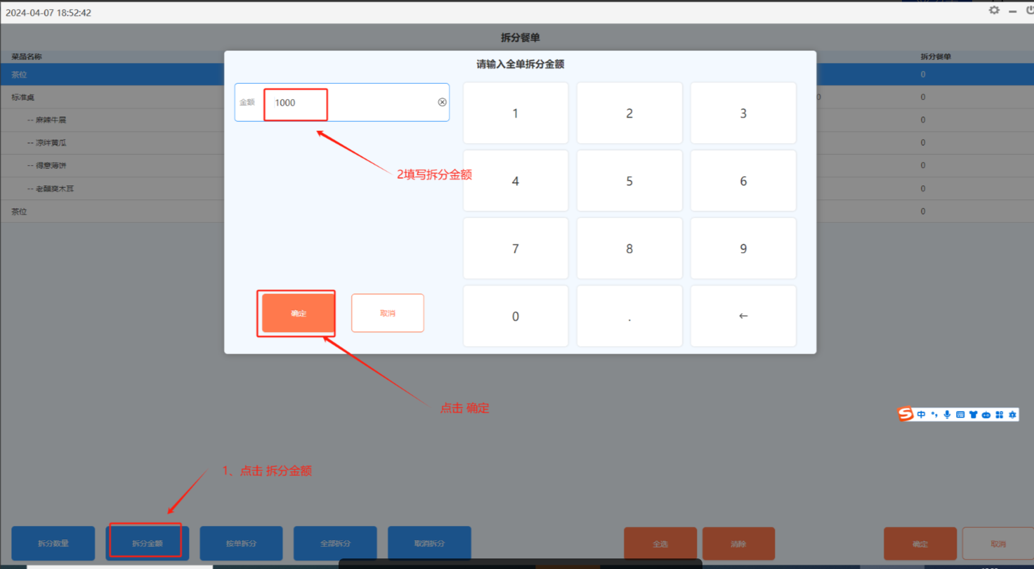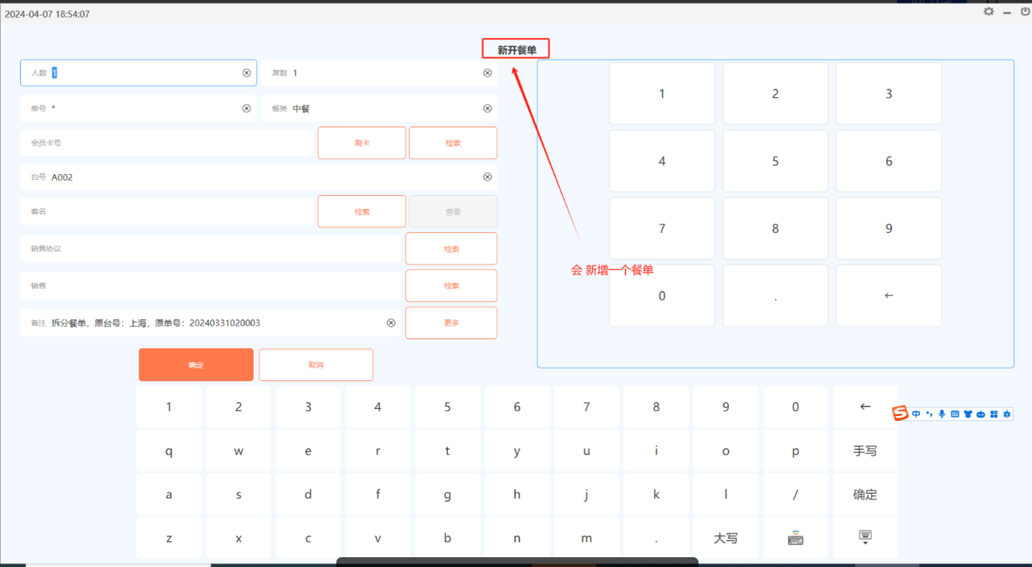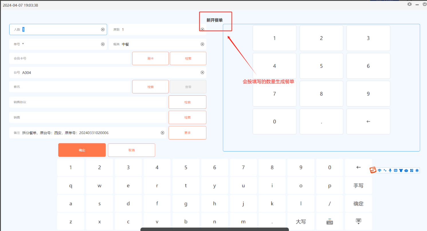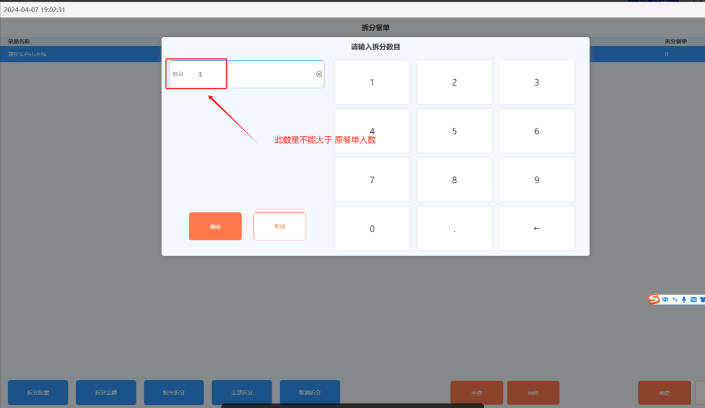按单拆分:整单按数量拆分(拆分数目不能大于就餐人数);