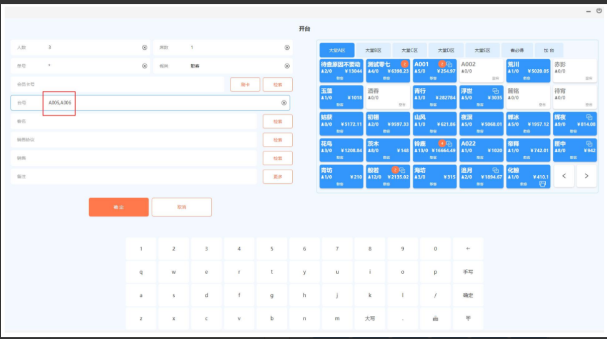 业务说明: 多张餐台统一结账的情形,客人在多张餐台消费,而只用一张结账单进行结账。 操作步骤: 与新开台操作类似,所不同的是在台号字段中输入多个台号。如下图