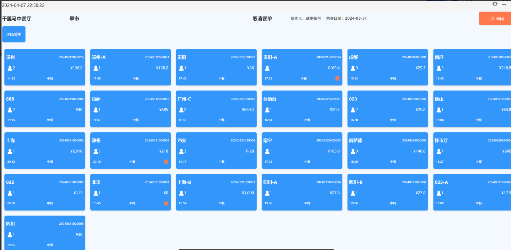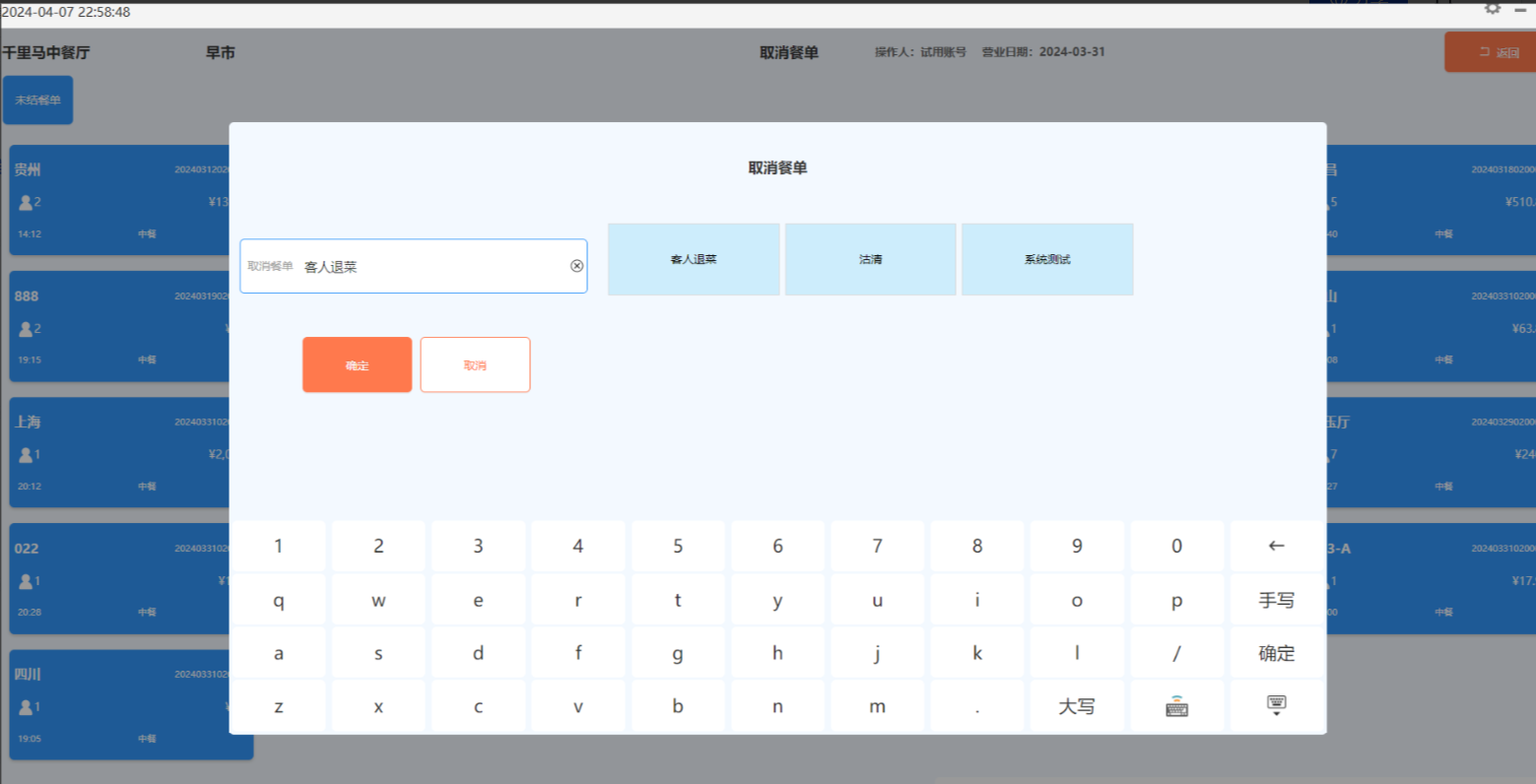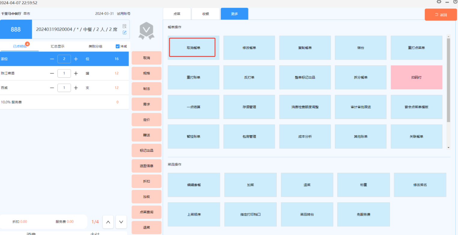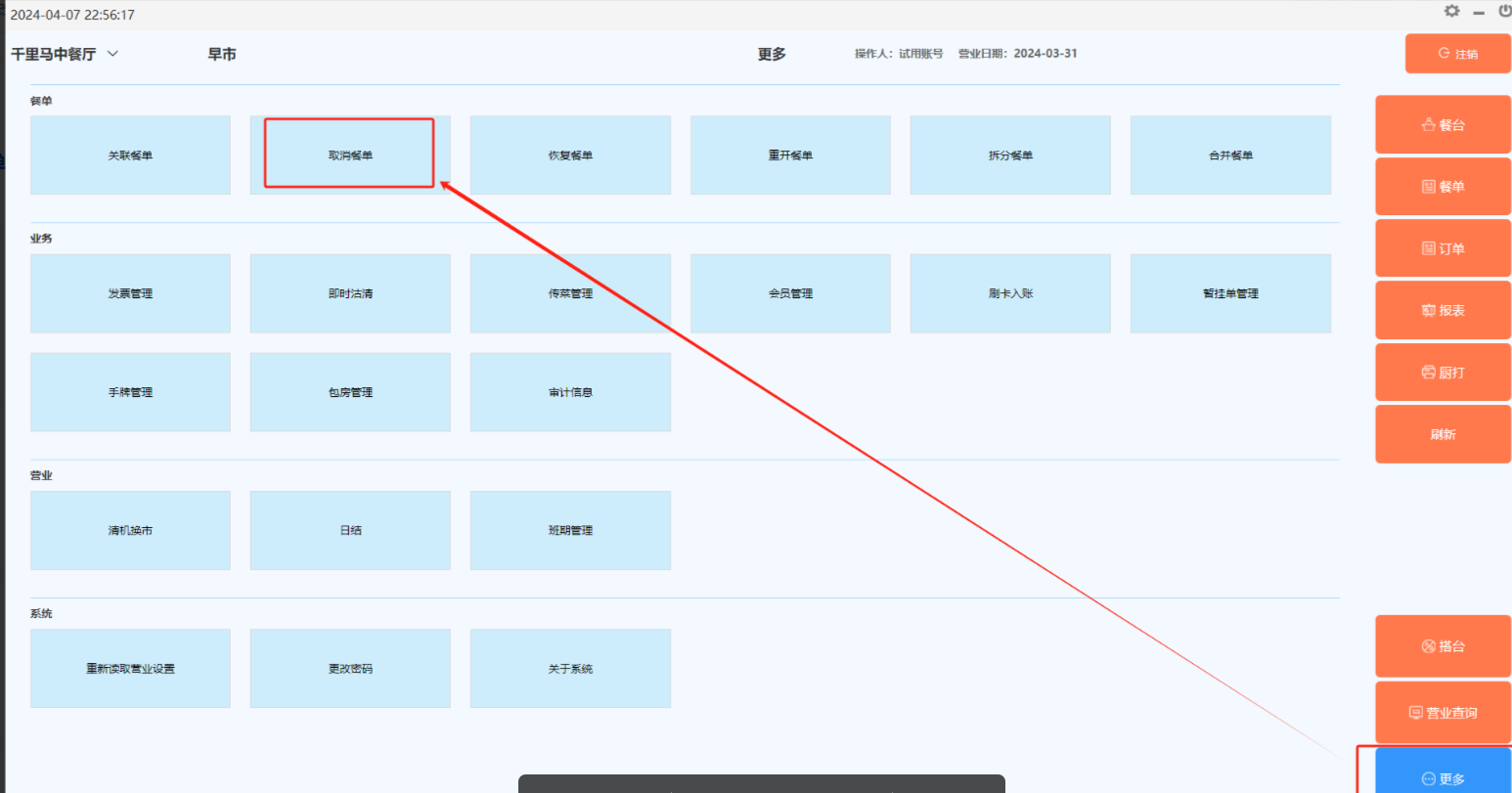 方法一:在台态图的“更多”功能中选择“取消餐单”,然后选择某张餐单,输入取消原因。。如 下图所示