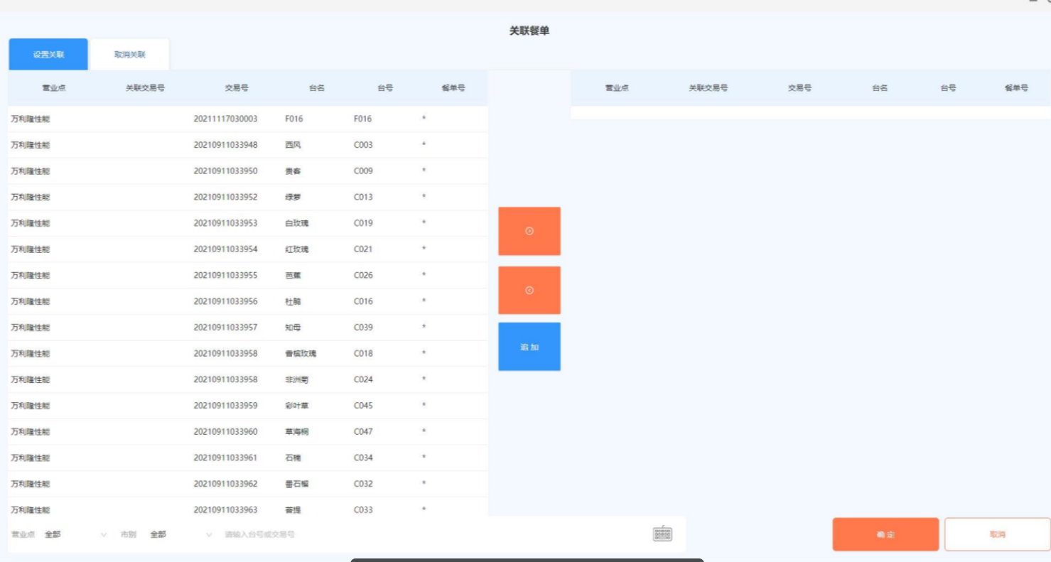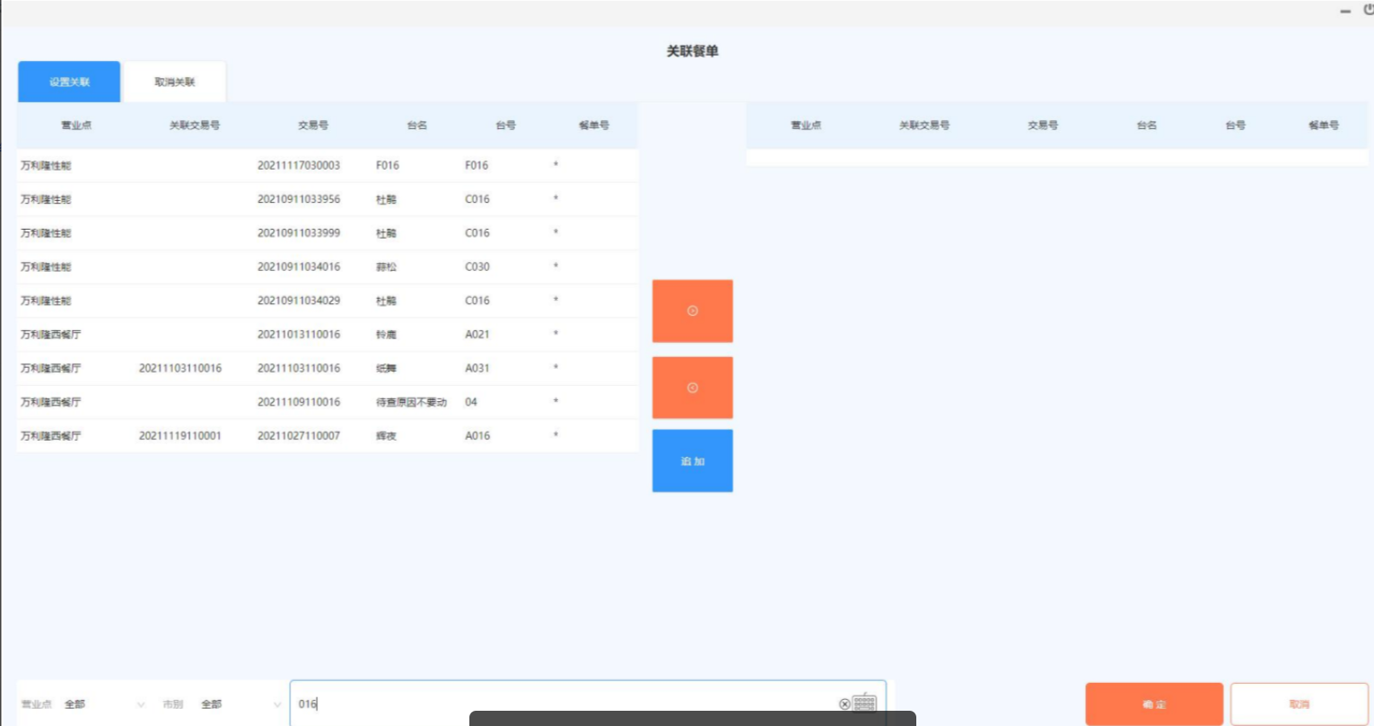 4、追加:任意选中一张已做关联的餐单,点追加,与此关联的餐单全部移动右边。选择完 成,自动默认选中下一行;