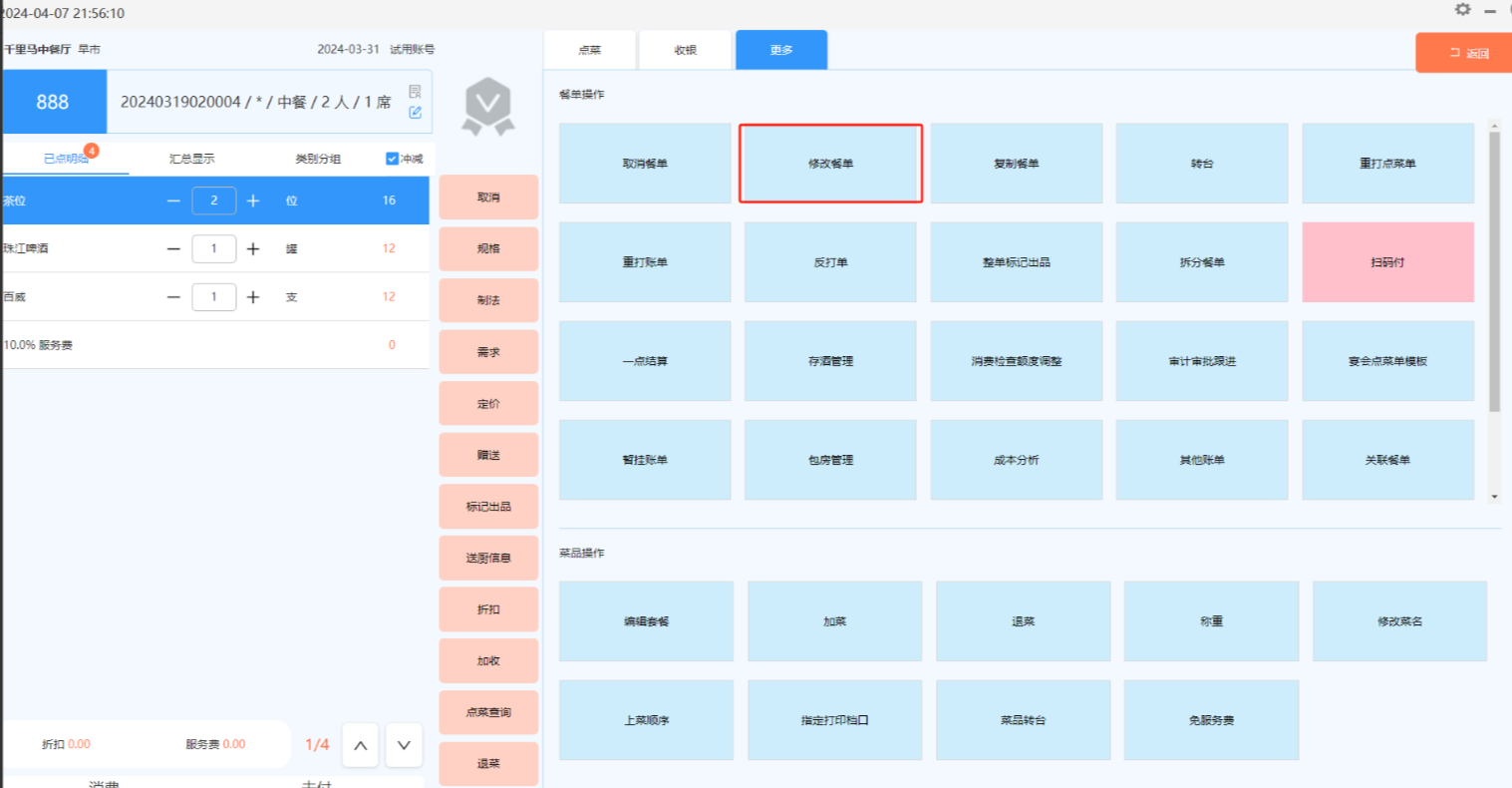生成餐单后,有时要修改餐单的某些信息如餐单号、人数、餐单备注、席数、客户名、销售员、餐类等。