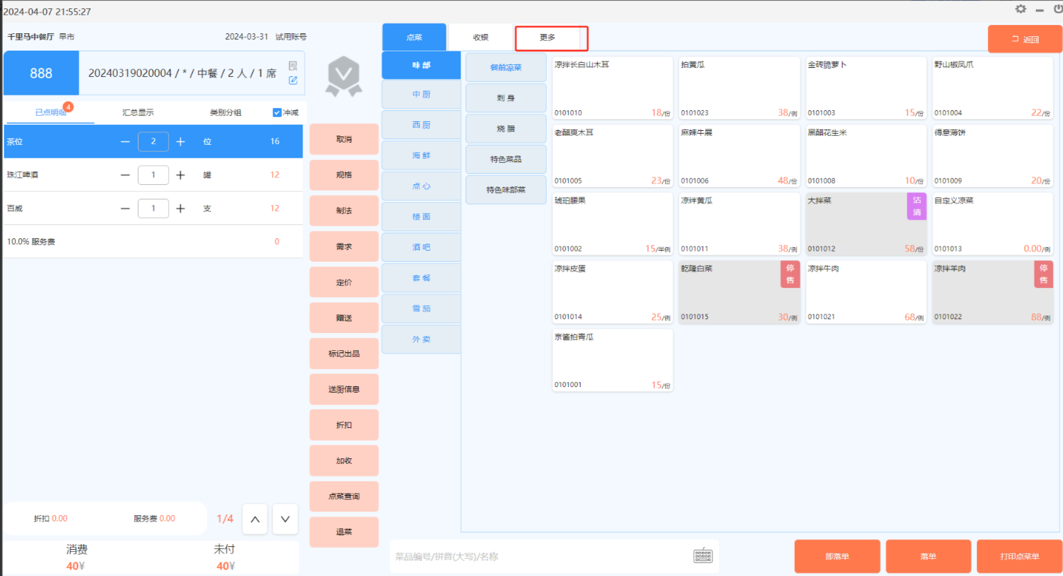 如下图,确定后未落单且点菜后未打印账单的菜品数量被修改成与席数相同
