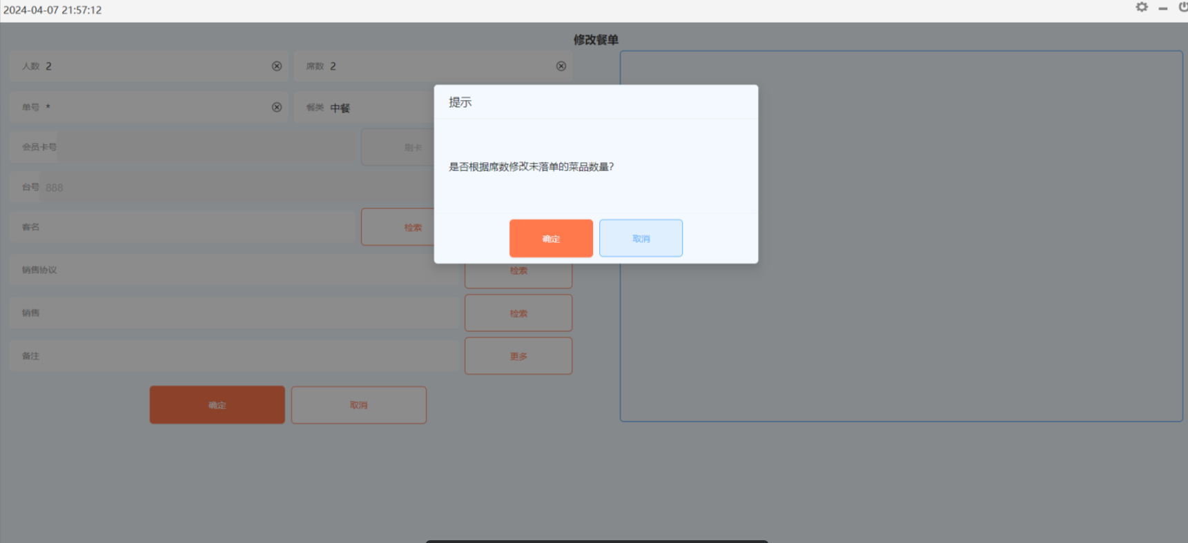 3、修改席数后,提示是否根据席数修改未落单菜品的数量,