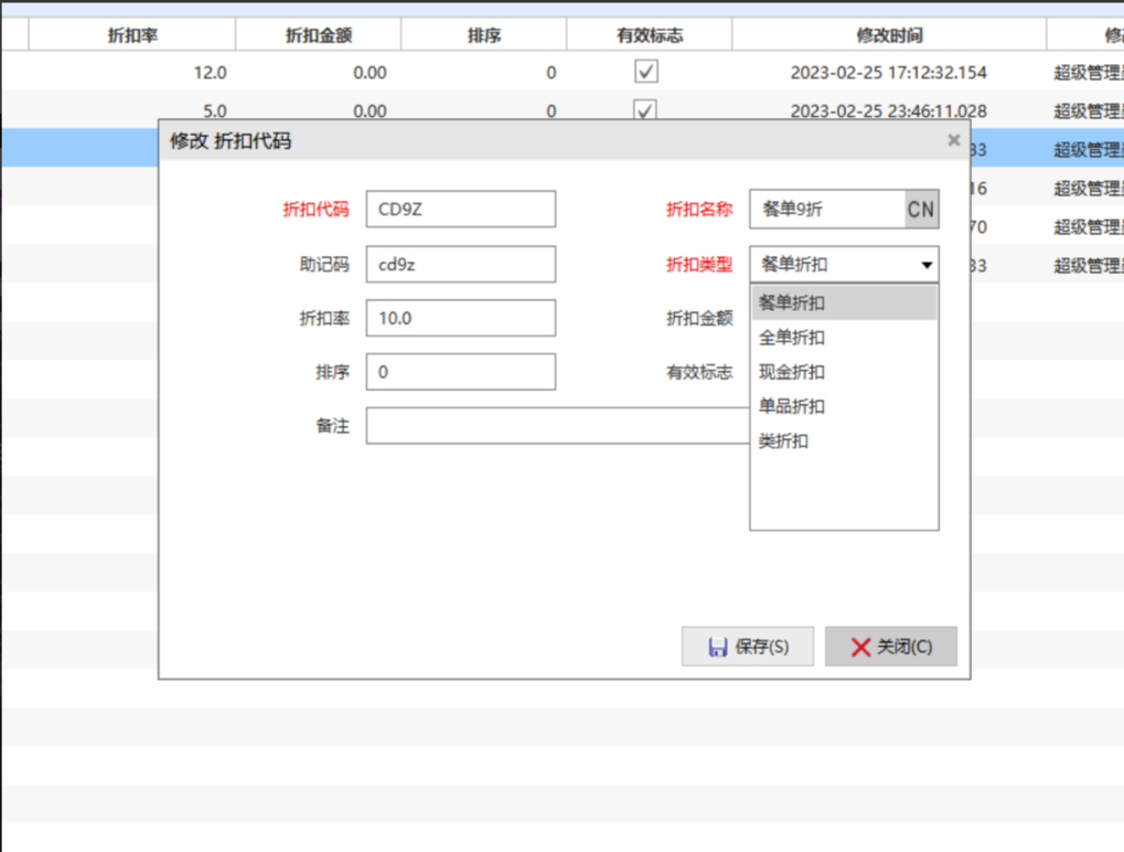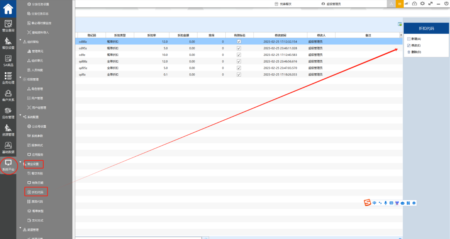登录IFBMcould管理单元‘系统平台模块’下的‘营业设置’子模块下的‘’折扣代码‘’,在此可以进行支付方式增、删、改功能;