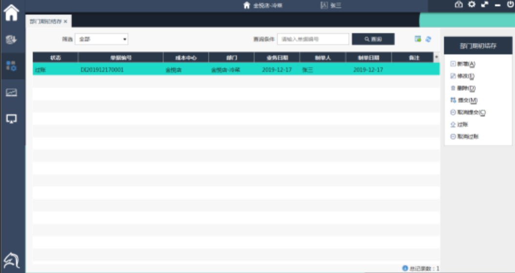 部门期初结存的主要功能包括:新增、修改、删除、提交、取消提交、过帐、取消过账。如图