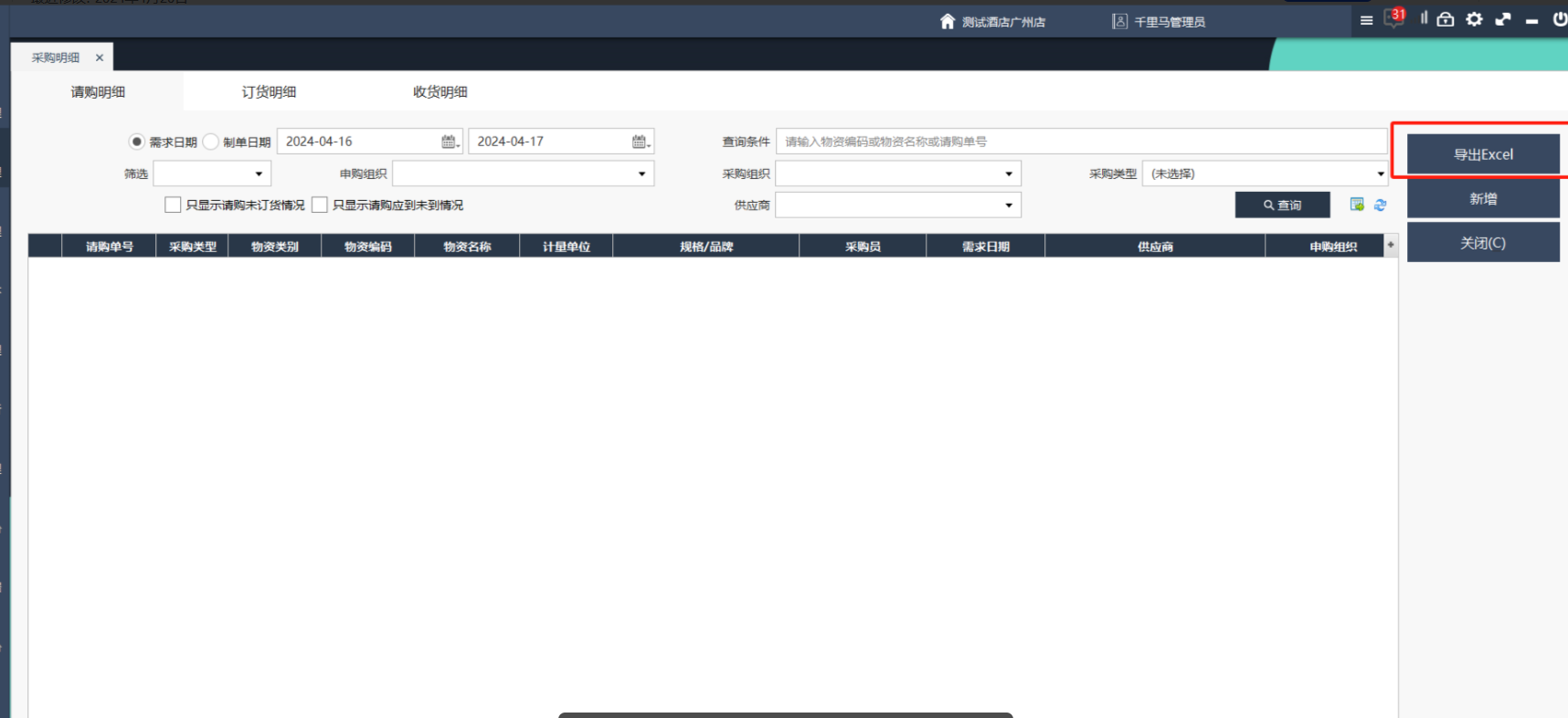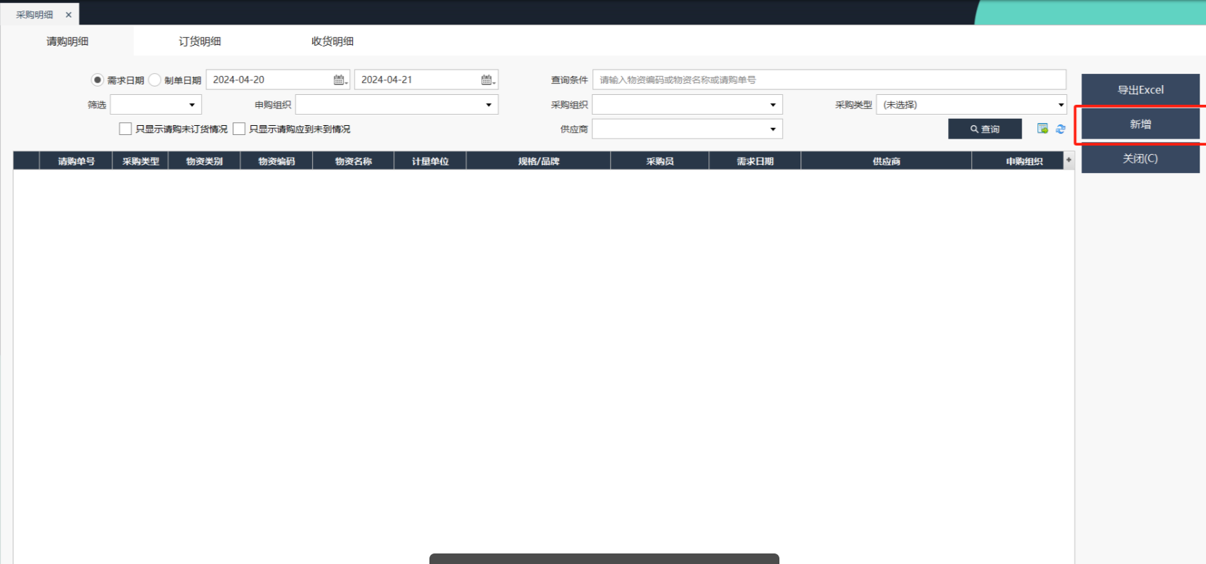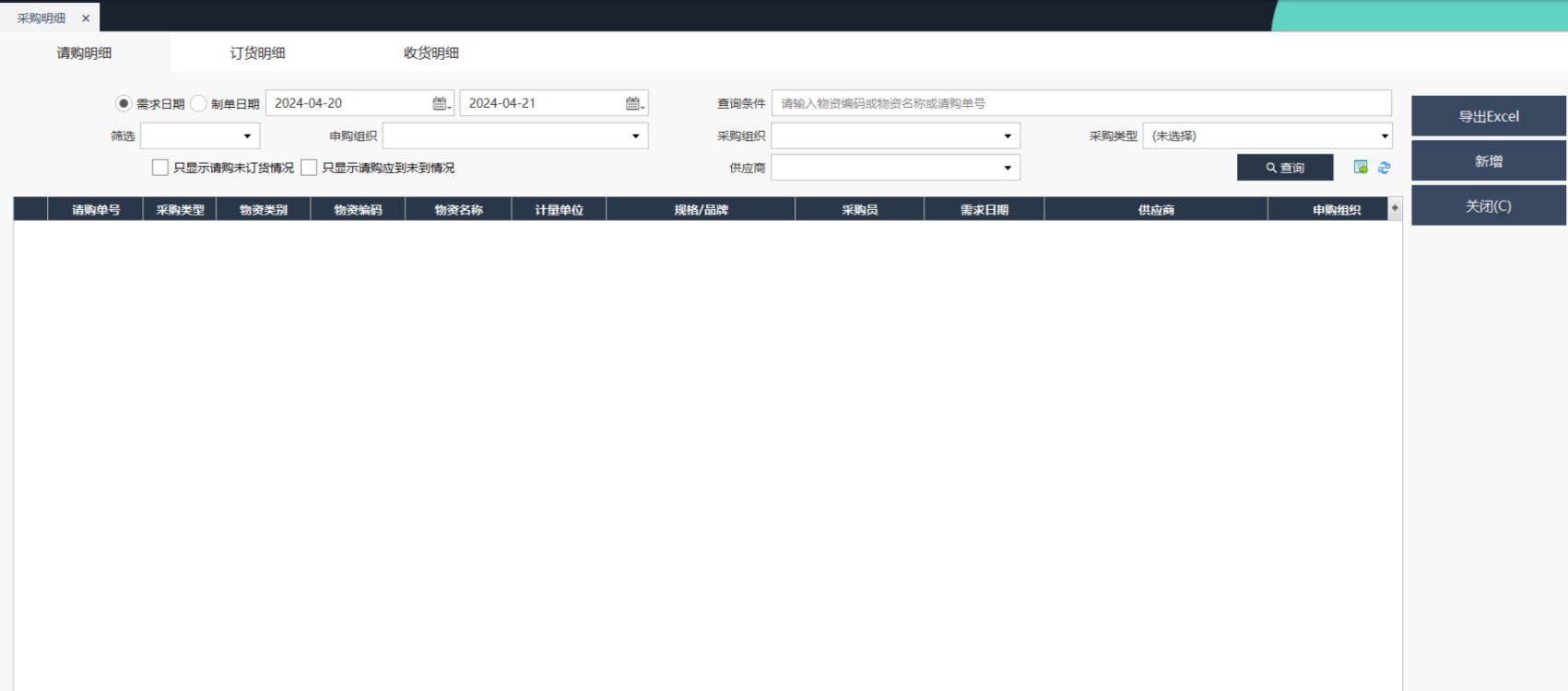 用于查看请购单、订货单、收货单的明细信息,功能有查询、导出Excel