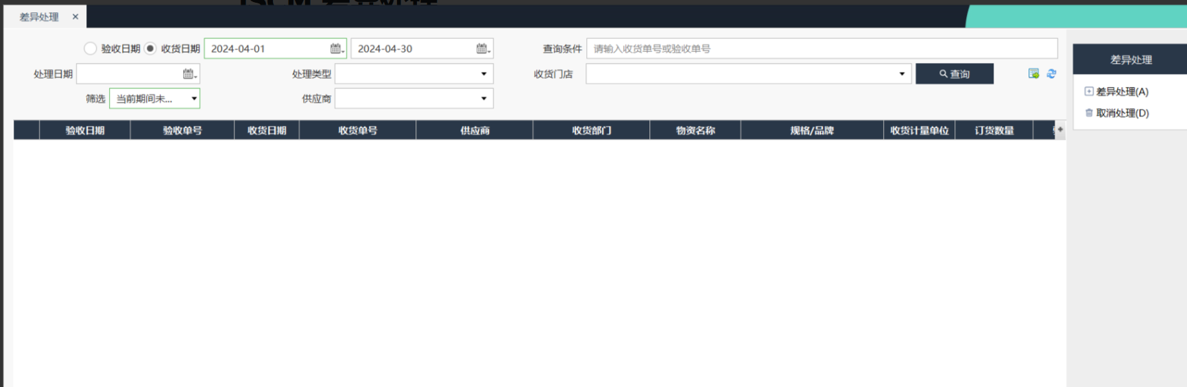 差异处理是针对验收单和收货单有差异的单据进行处理操作。
