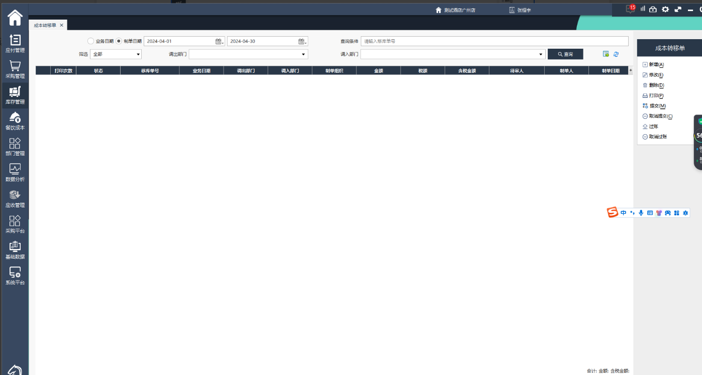 登录供应链系统→‘库存管理’→‘成本中心业务’→‘成本转移单’即可进入成本转移单管理主界面。