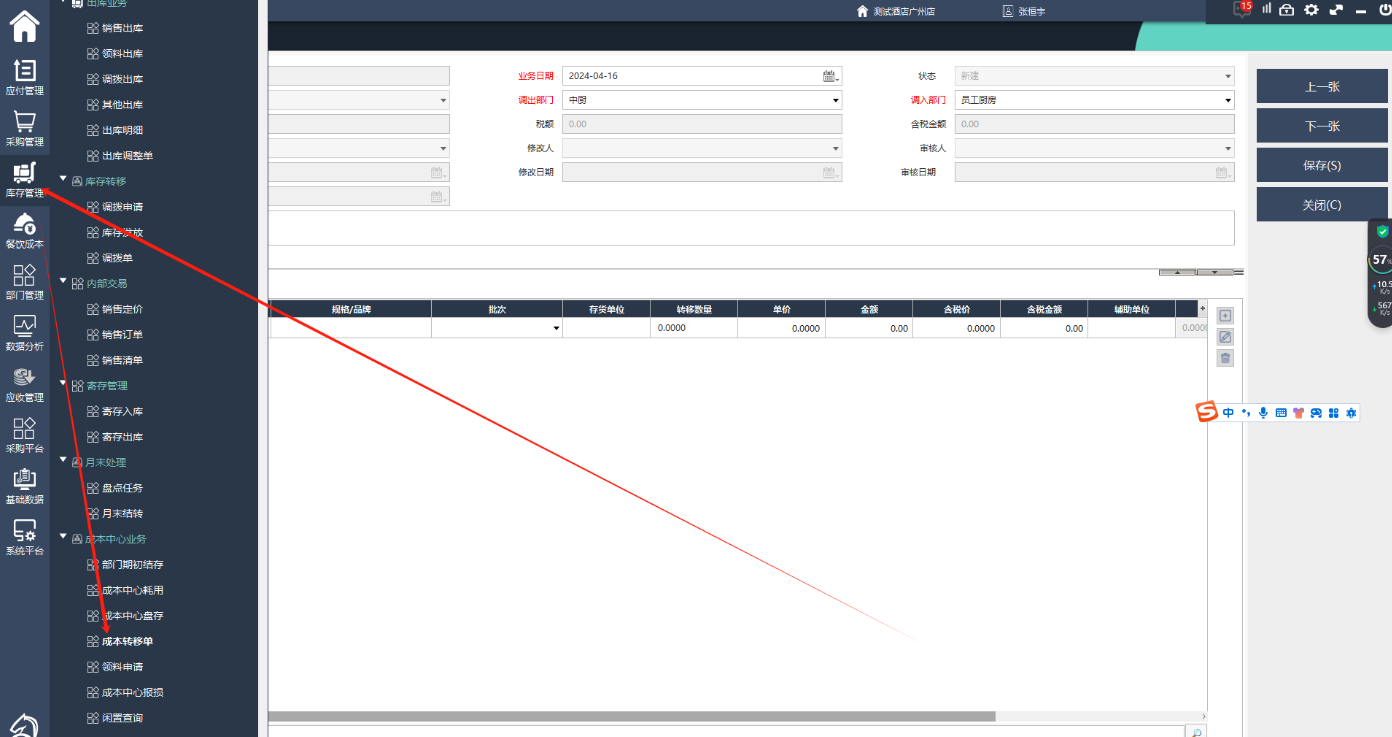 新增:新增一个成本转移单;