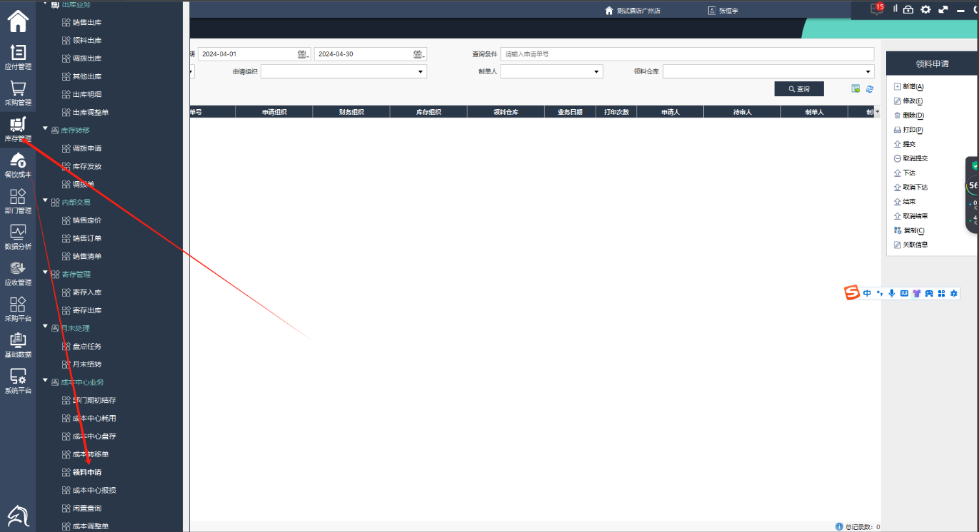 登录供应链系统→‘库存管理’→‘成本中心业务’→‘领料申请’即可进入领料申请单管理主界面。