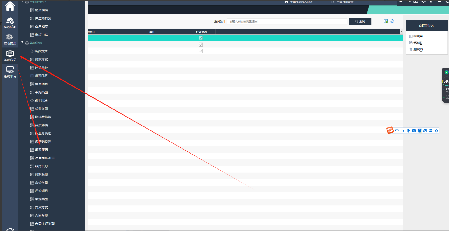 查询达到闲置期限的物资EnableIdleItems是否启用闲置管理N (否)是否启用闲置管理Y:启用;N:不启用参数=Y,盘存单、请购单、订货发放、订货单有闲置标记,可在盘存处理时标记物品为闲置。销售出库增加“出库部门”列,可按部门出库参数= N,不启用SCM_IdleItemsQueryScope闲置查询范围S (当前管理单元)闲置查询范围V:当前分公司;S当前管理单元。作用于[ 闲置查询 ]菜单SCM_requireIdleItems申购闲置物品原因是否必填Y (是)申购闲置物品原因是否必填Y:必填;N:不必填控制请购单。 登录供应链系统管理单元-基础数据-闲置原因,即可进入闲置原因管理主界面。 闲置原因用于描述物资被设置为闲置的原因。作用于盘存单标记物资为闲置时所需填写的原因。功能包含:新增、删除、修改。
