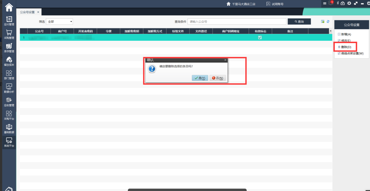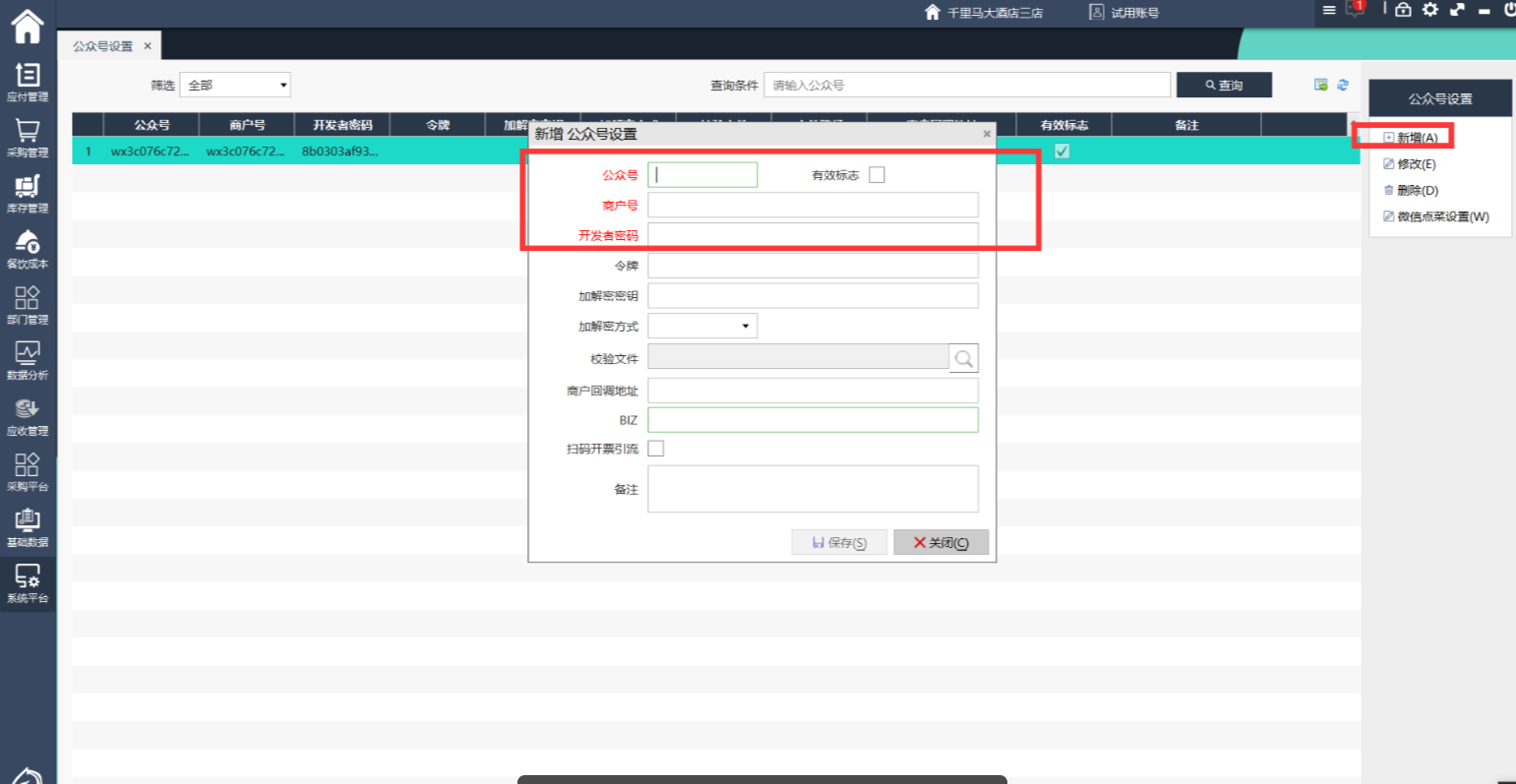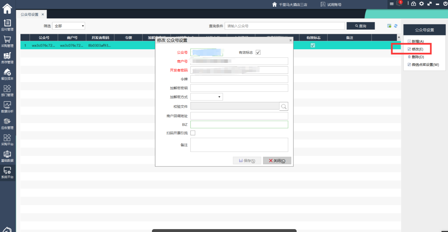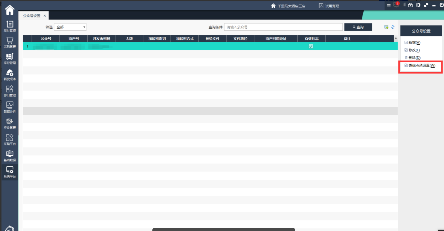 1、左侧点击系统平台,选择公众号设置2、点击右侧新增,在弹出界面填写公众号id,商户号(与公众号id一致),开发者密码(丢失后只能重置,谨慎保存),勾选有效标志并保存3、点击右侧修改,可以对公众号设置的内容进行修改4、点击右侧删除,可以将配置删除,或者修改为无效也可以5、微信点菜设置在餐饮后台ifbmcloud中设置
