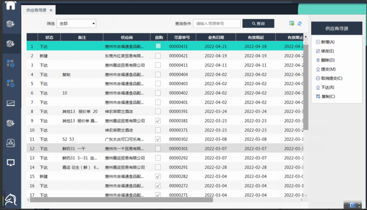 供应商寻源,企业可根据实际需求和品类情况设置物资在有效期内,默认的货源供应商。同一个时间段,允许设置单个或多个货源供应商,默认最新设置的供应商为物资默认货源供应商。支持制订直购型货源管理,并对货源管理进行审核,部门申购时,如选择直购型货源,在部门申购下达后,可直接生成订货单,并通过供应商中心向供应商直接下达订单。