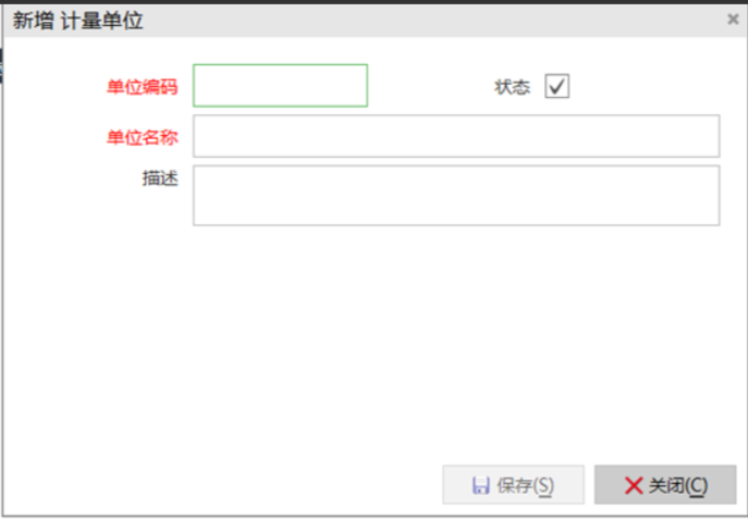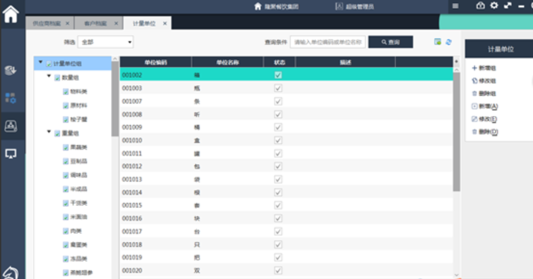 计量单位的主要功能包括:新增单位组、修改单位组、删除单位组、新增、修改、删除、禁用、启用、退出。如图