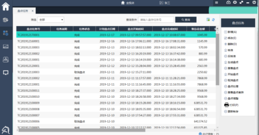 盘点任务的主要功能包括:新增、修改、删除、提交、核准、反核准、生成盘点、查看盘点、开始盘点、取消盘点、盘点处理、查看盘点差异、盘点调整、打印、更新结存。如图