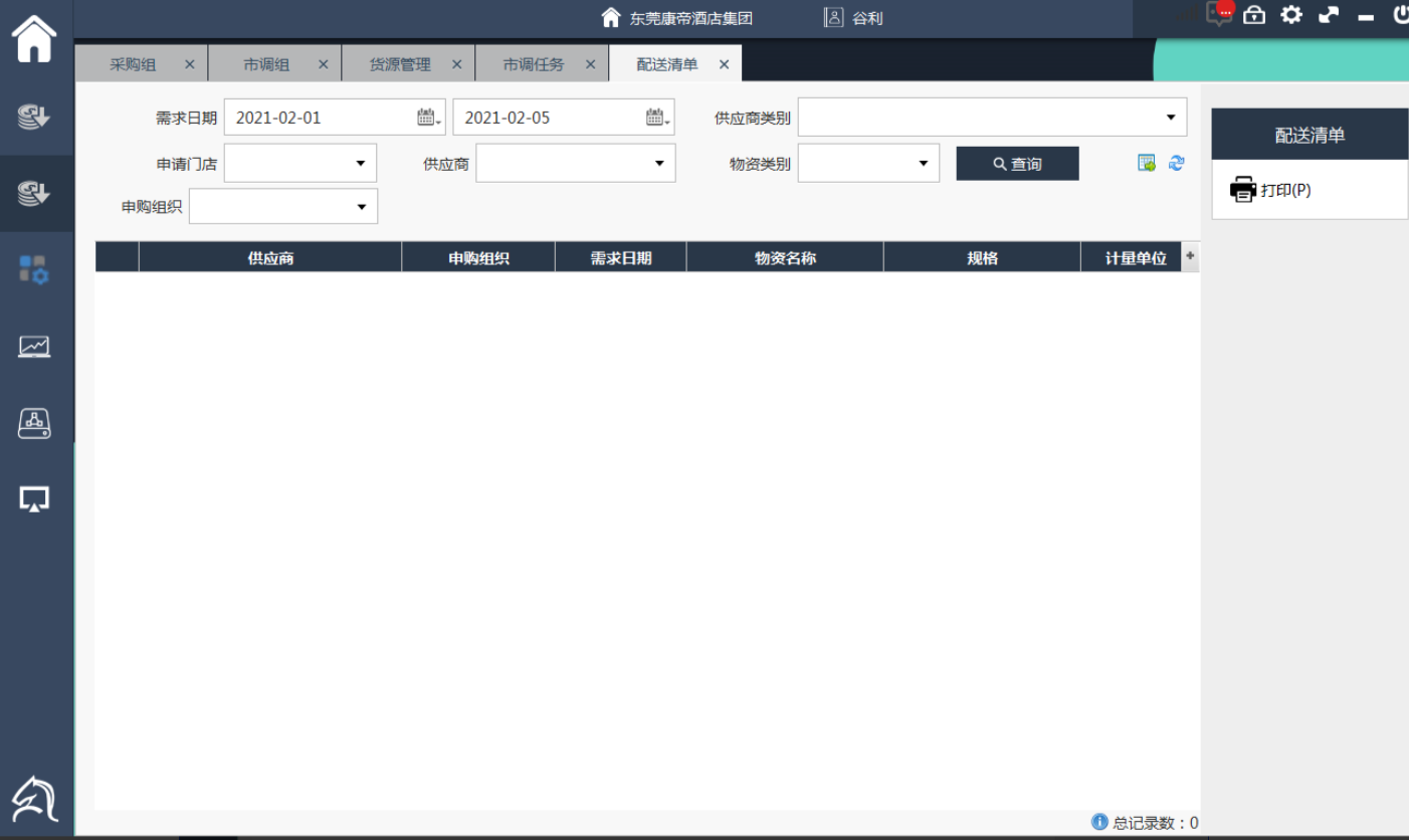 配送清单由订货发放生成,订货发放同时生成订货单及配送清单,酒店可根据配送清单进行配送物资。