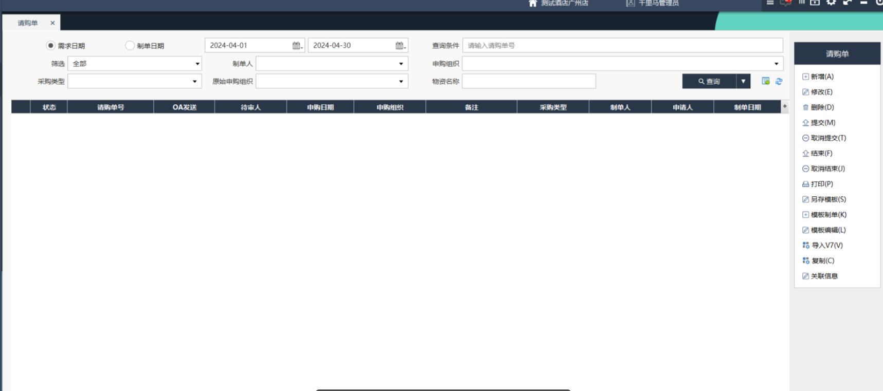 请购单的主要功能包括:新增、修改、删除、提交、取消提交、结束、取消结束、打印、另存模板、模板制单、模板编辑、导入v7、复制、关联信息