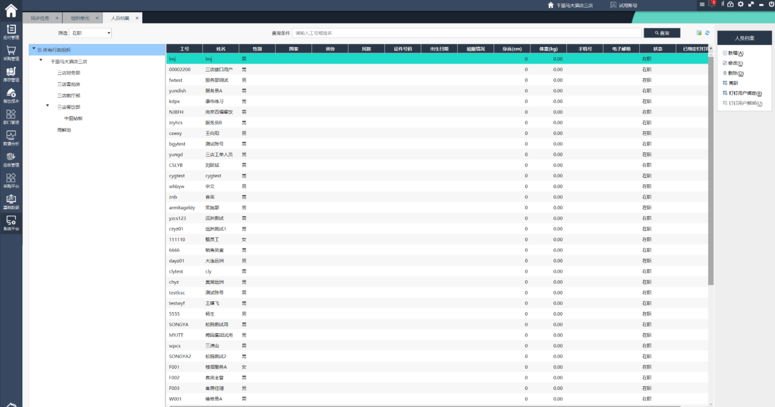 员工档案主要用来维护登录用户的详细资料信息,预留与人事系统的接口。