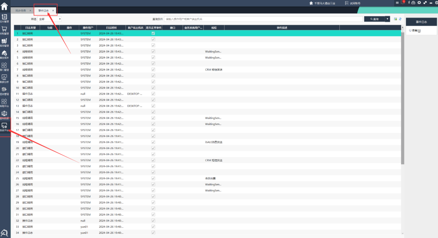 点击[系统平台-系统管理-事件日志]主功能菜单,即可进入事件日志主界面: