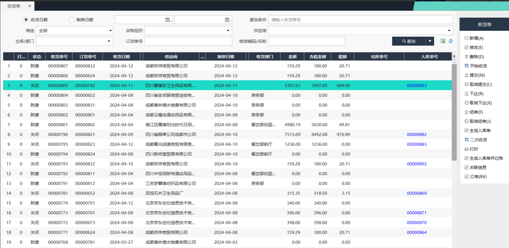 收货单的主要功能包括:新增、修改、复制、删除、开始收货、提交、取消提交、下达、取消下达、结束、取消结束、生成入库单、二次收货、关联信息、订单评价。如图: