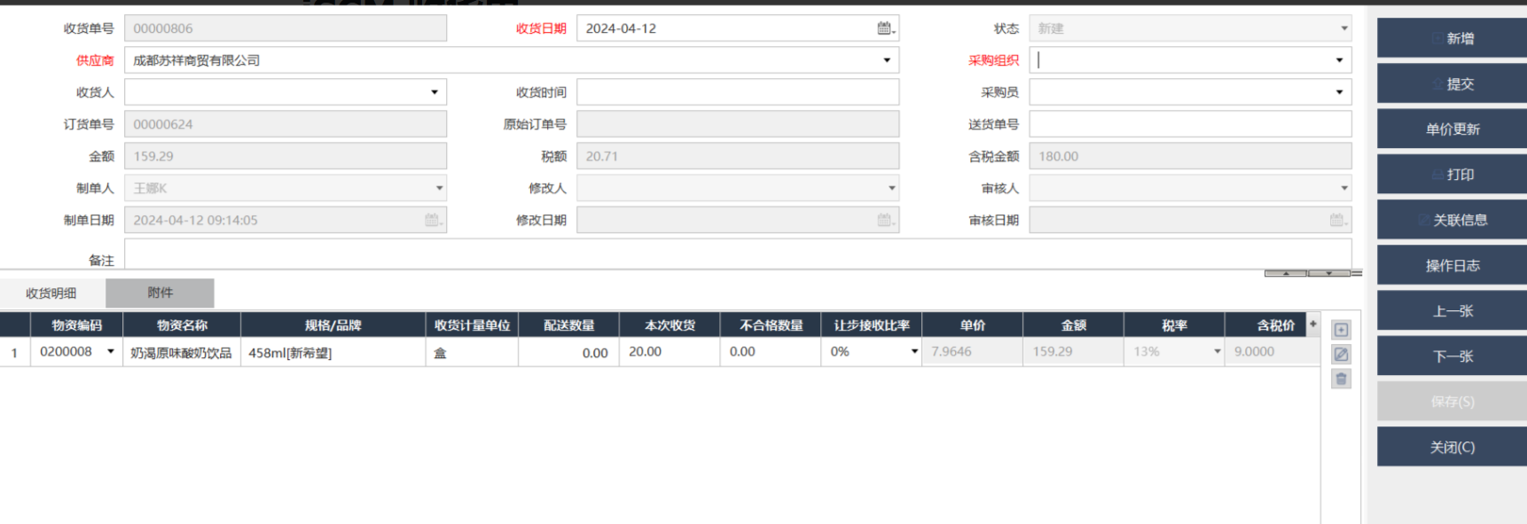单价更新:如果物资的价格有变动,重新进行了定价,那么可以点击单价更新对收货物资的单价进行变更。