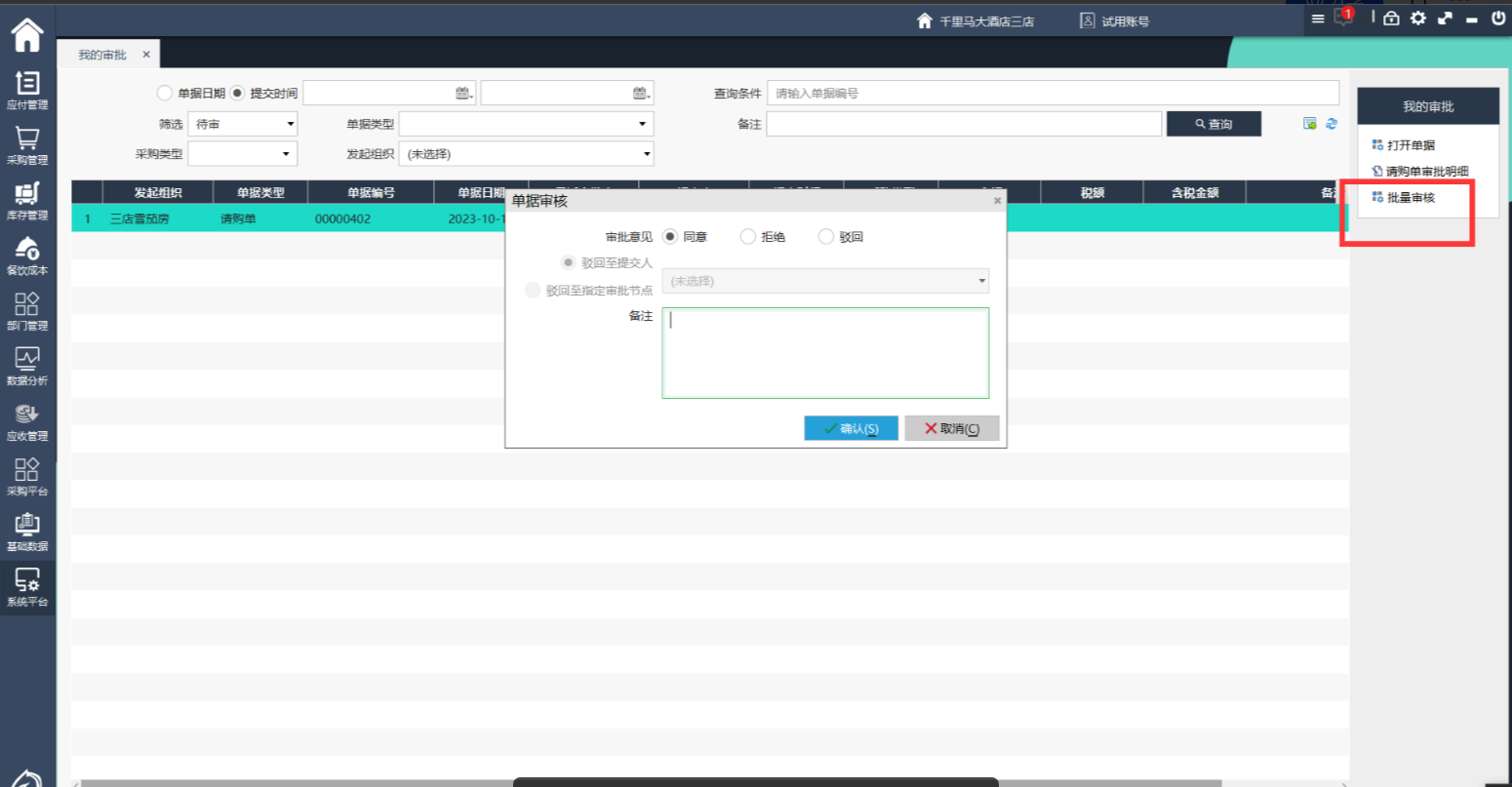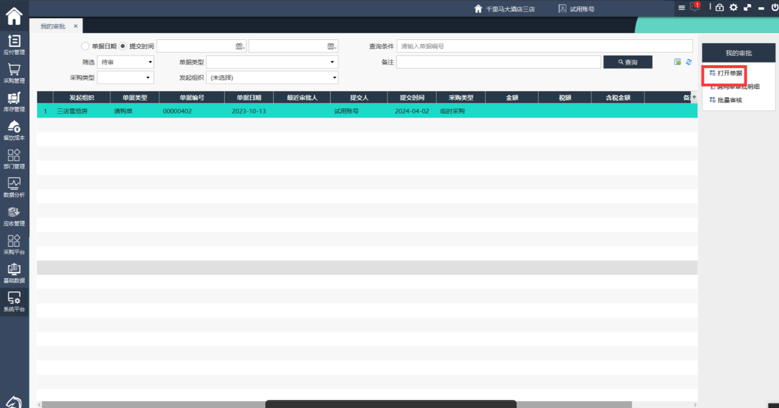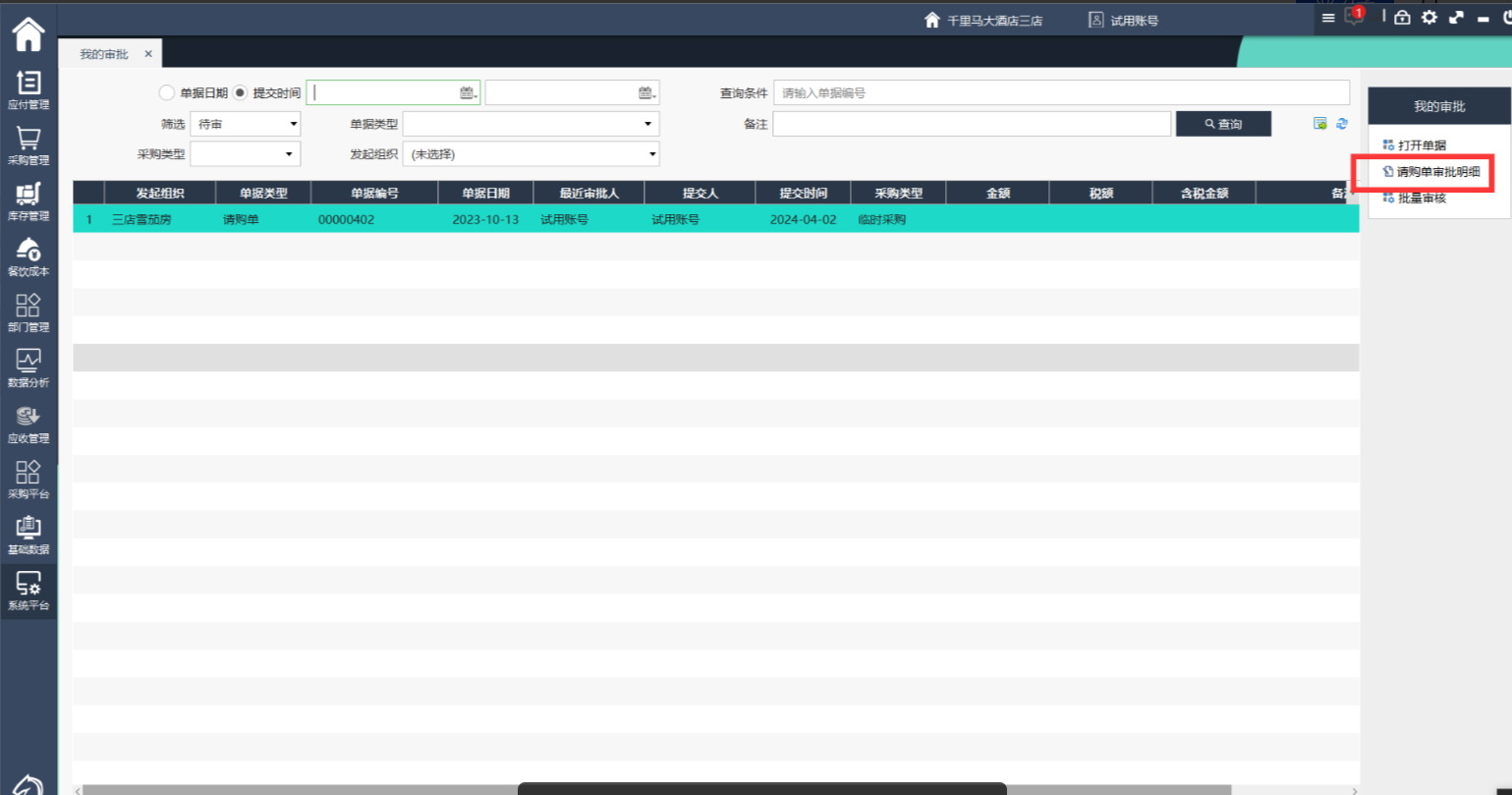 1、登录对应账号和组织,左侧点击系统平台,选择我的审批2、打开单据:打开当前单据并查看具体的单据信息3、审核:即当前单据通过审核、拒绝、驳回4、反审核:单据出现问题后,且已经审核只能反审核将单据返回到上一步5、请购单审批明细:查看当前单据的审批明细6、批量审核:批量对单据过审、拒绝、驳回
