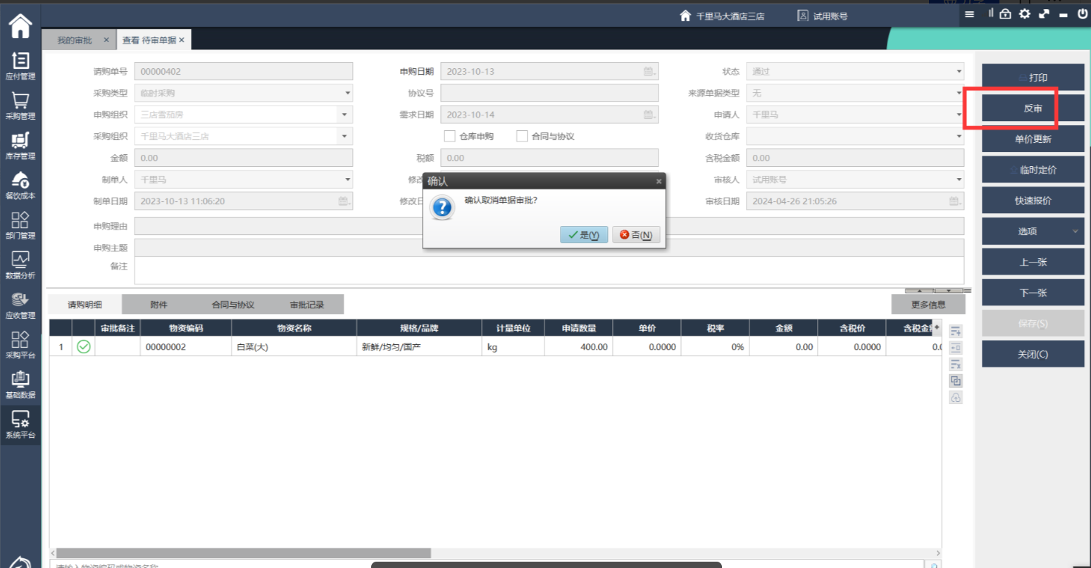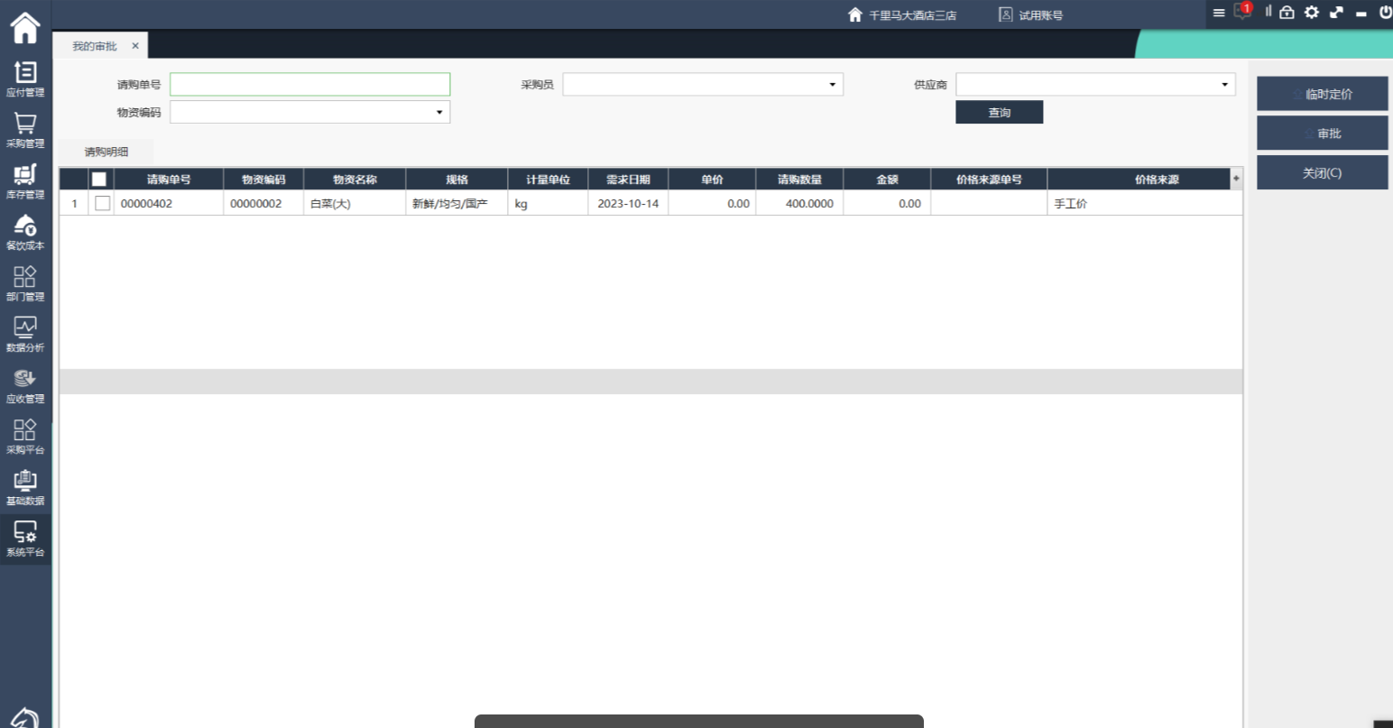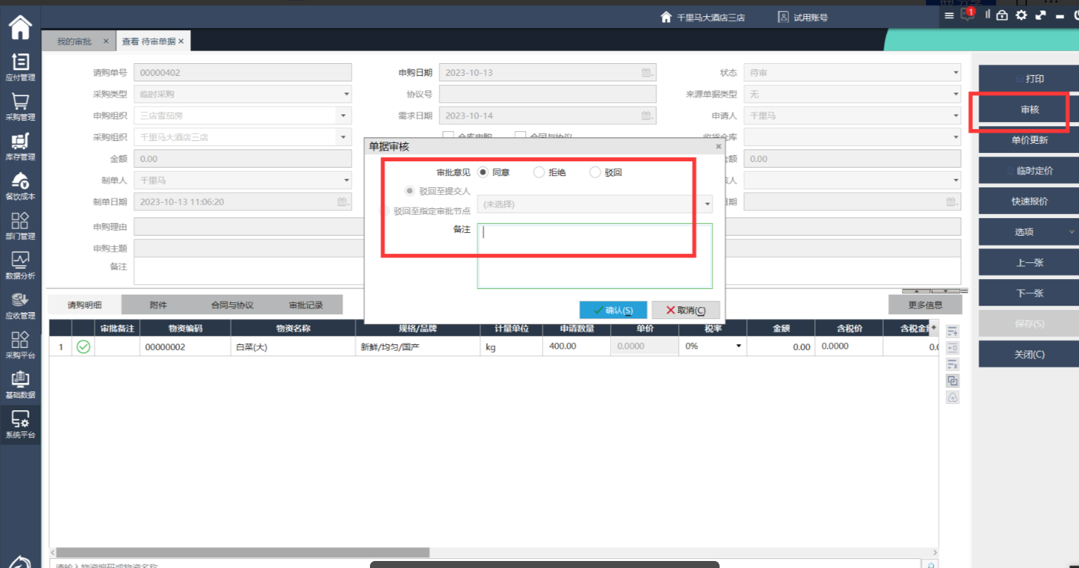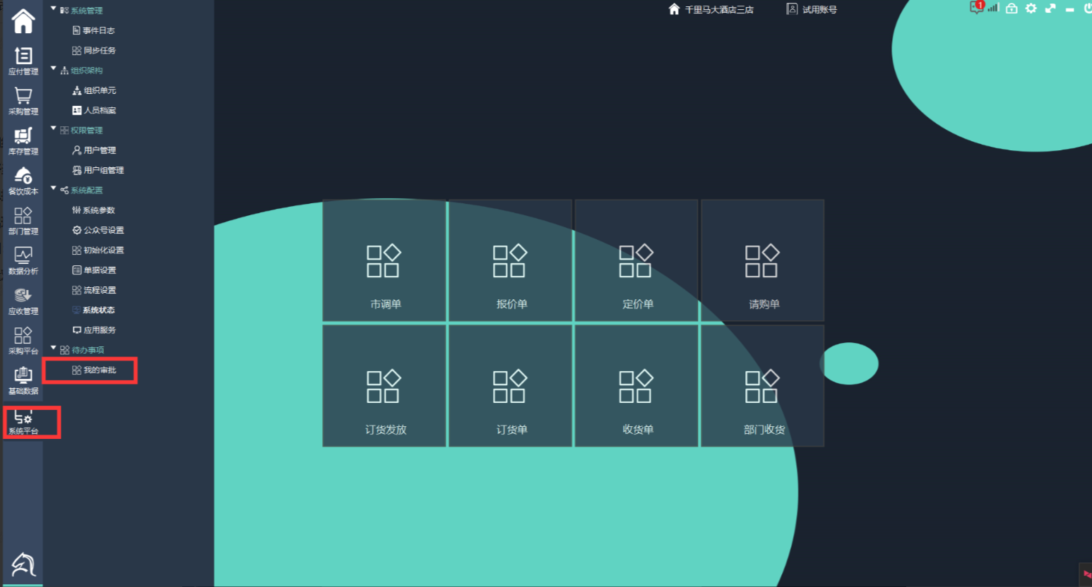 1、登录对应账号和组织,左侧点击系统平台,选择我的审批2、打开单据:打开当前单据并查看具体的单据信息3、审核:即当前单据通过审核、拒绝、驳回4、反审核:单据出现问题后,且已经审核只能反审核将单据返回到上一步5、请购单审批明细:查看当前单据的审批明细6、批量审核:批量对单据过审、拒绝、驳回
