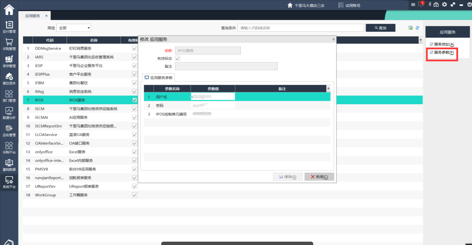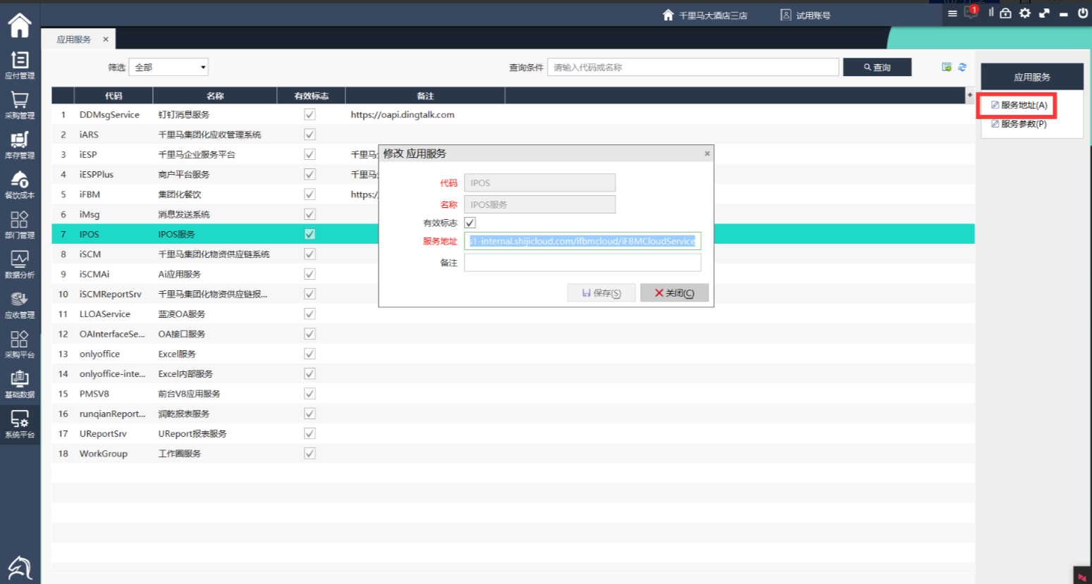 1、管理员账号登录,左侧选择系统平台,选择应用服务应用服务是指系统使用业务服务,需要先启用服务,并配置服务地址2、点击服务地址,可以修改此项服务的服务地址显示此服务的代码、名称、是否有效、服务地址等3、点击服务参数,可以修改此服务的相关参数设置