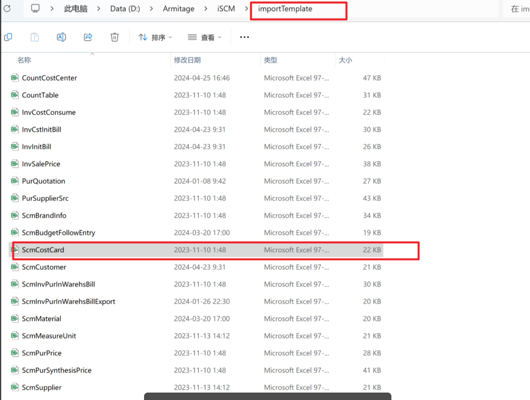 导入:根据我司提供的模版进行批量导入成本卡构成明细,模版获取方式:选中iSCM程序,右键打开文件位置,在程序安装根目录下点击importTemplate文件夹,文件夹中的ScmCostCard.xls文件就是成本卡的导入模版。