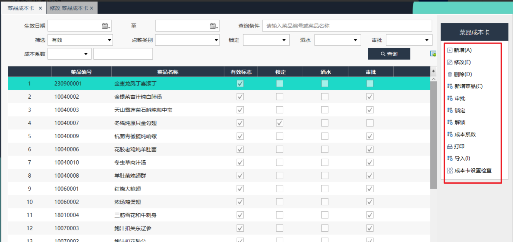 审批:审批成本卡,审批成本卡成功,成本卡中的审批字段勾选。成本卡只有审批成功才会生效(未审批成本卡,不会计算菜品成本)