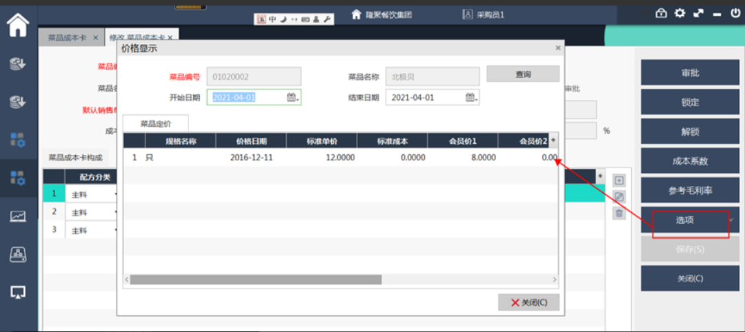 价格显示:用于查看成本卡菜品的定价情况。定价来源:IFBM中菜品的定价设置