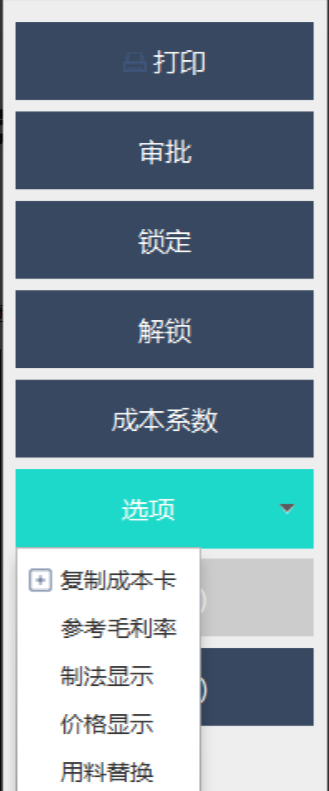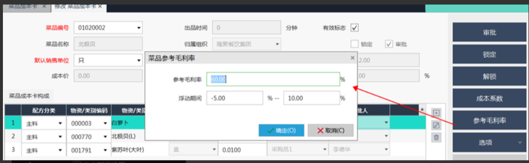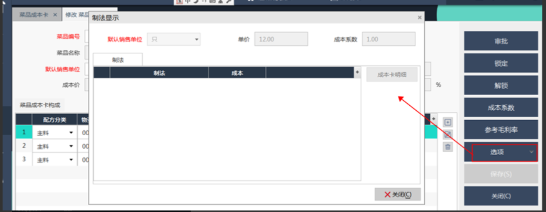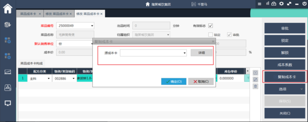 菜品成本卡操作:审批、锁定、解锁、成本系数、复制成本卡、参考毛利率、制法显示、价格显示、用料替换