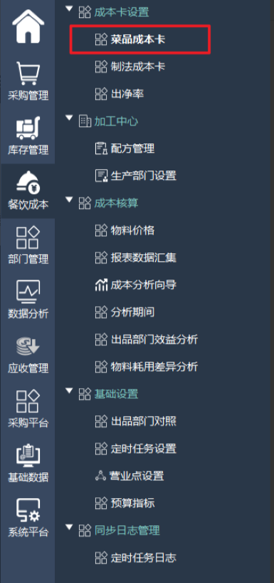 使用员工账号登陆到集团组织,设置集团菜品的成本卡