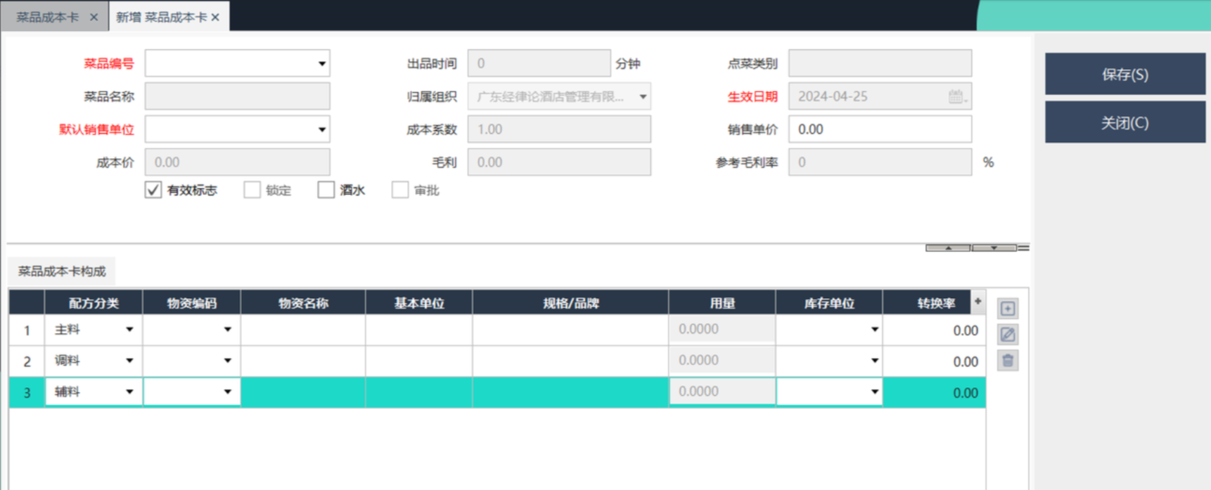 菜品成本卡视图中,点击新增,打开新增 菜品成本卡视图