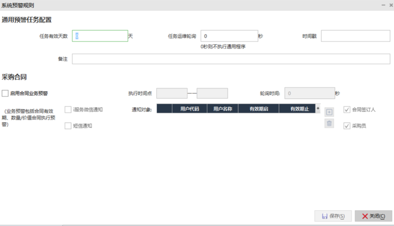 1)启用合同业务预警:Y/N,Y时,可设置执行执行时间点、轮循时间、通知对象等信息。反之,则不允许执行与设置;