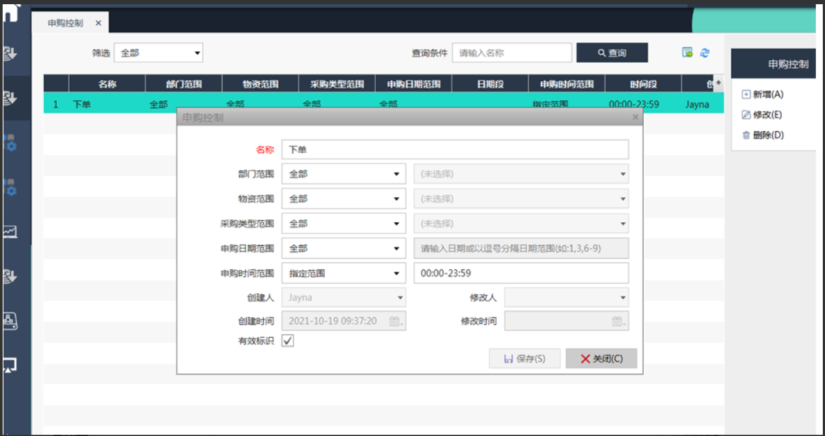 3.1申购控制用于满足企业在通过请购单报单购货时,通过系统规范各部门的申购时点,降低临时申购的频次,便于企业采购环节的统一管控。(前提:需开启 SCM_RequireForceValidate是否启用申购控制)。功能包括:新增、修改、删除,