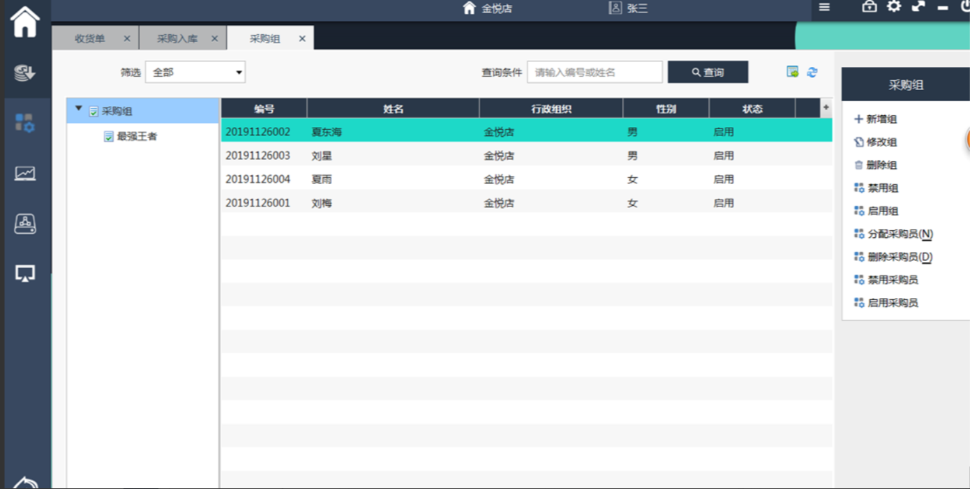 1.1采购组的主要功能包括:新增组、修改组、删除组、禁用、启用组、分配采购员、删除采购员、禁用采购员、启用采购员、分配组织、退出。