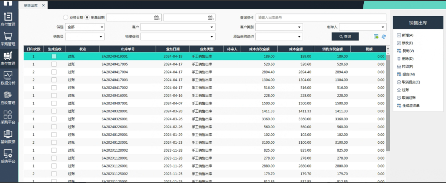 销售出库单的主要功能包括:新增、修改、复制、删除、保存、查询、打印、提交、过帐。