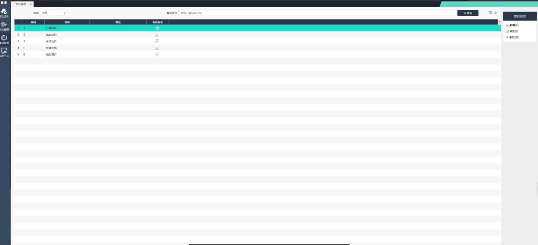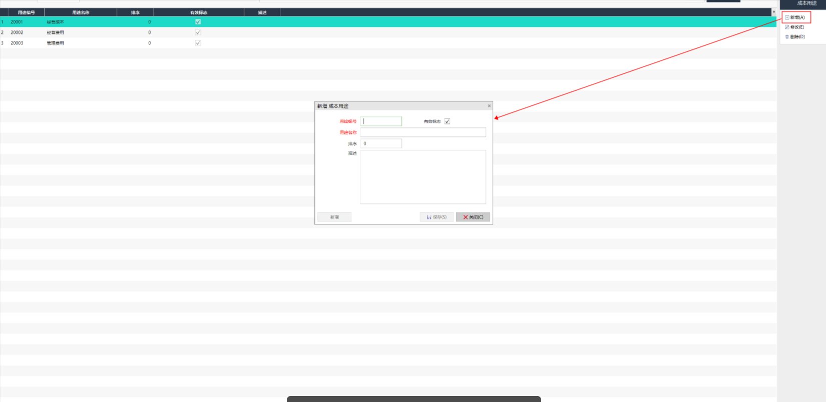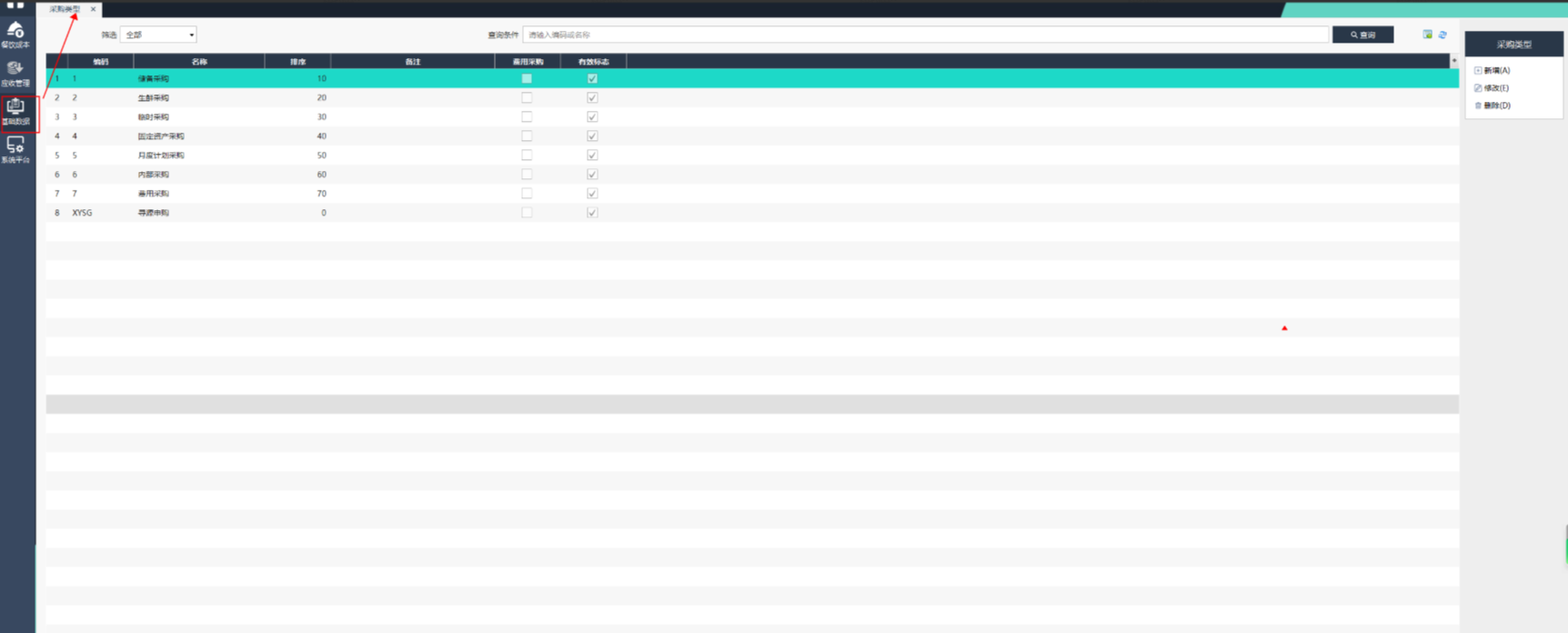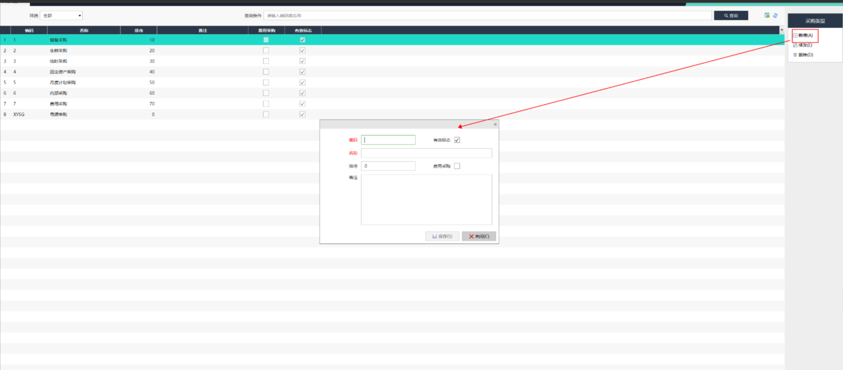 点击右侧功能新增即可完成新增采购类型,输入采购类型编码,采购类型名称。