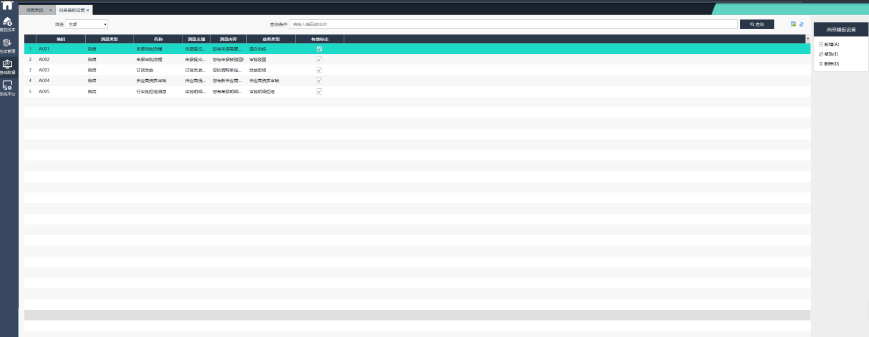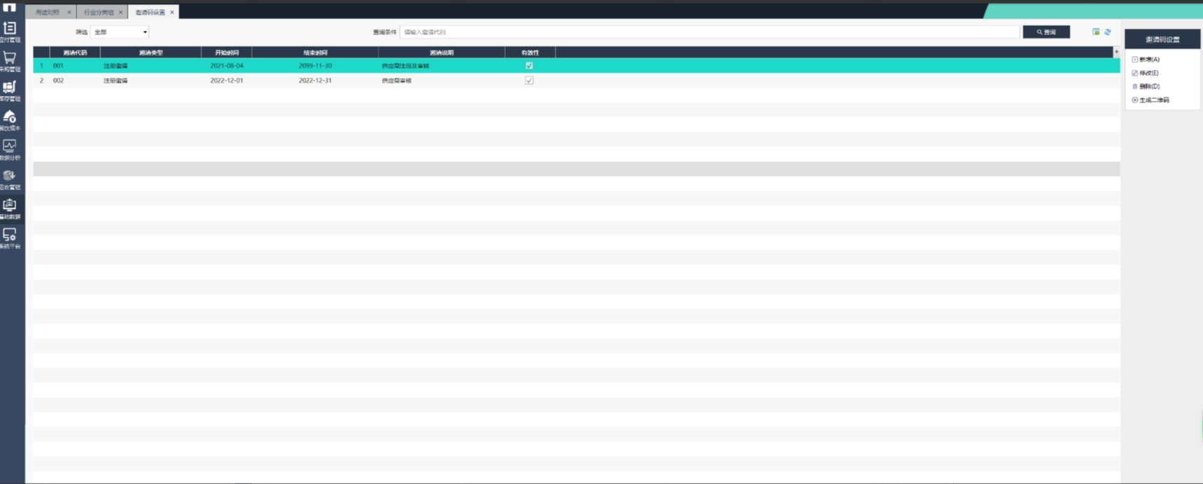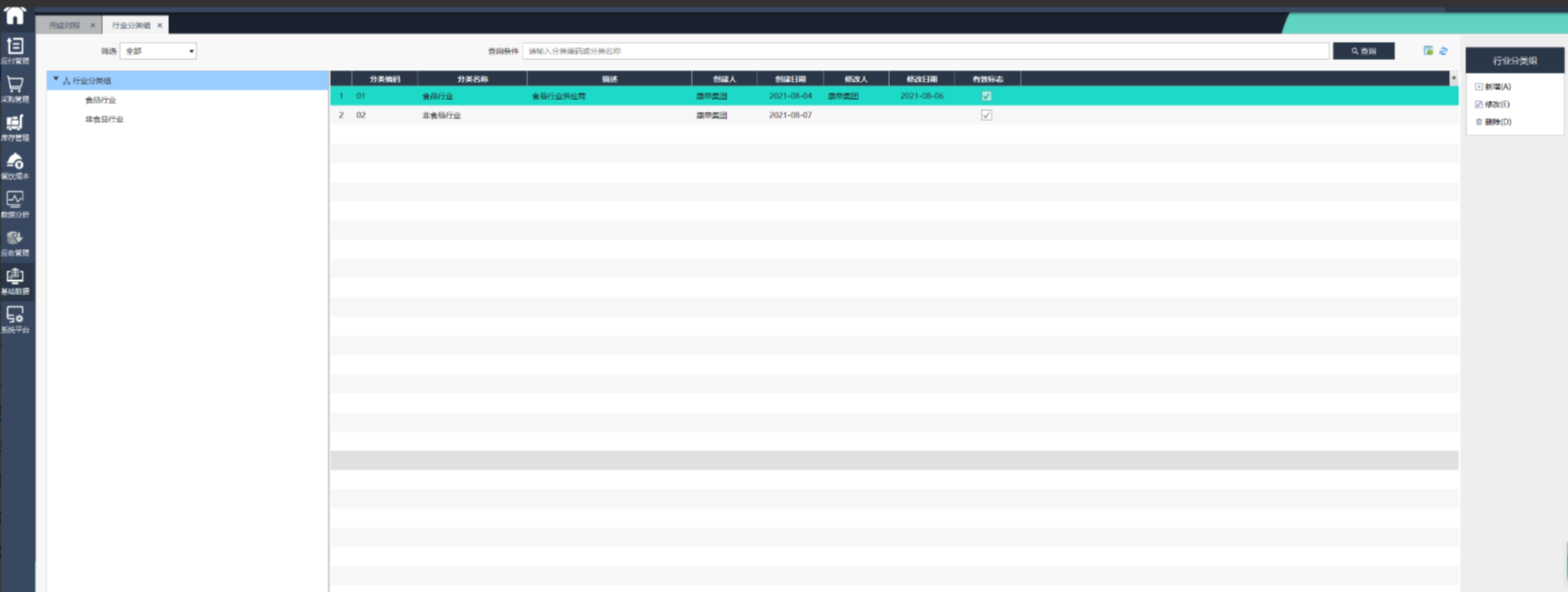 资质种类配合行业分类组对照设置,设置不同行业的供应商,与企业合作所需提供给企业的资质信息。功能包含:新增、修改、删除。