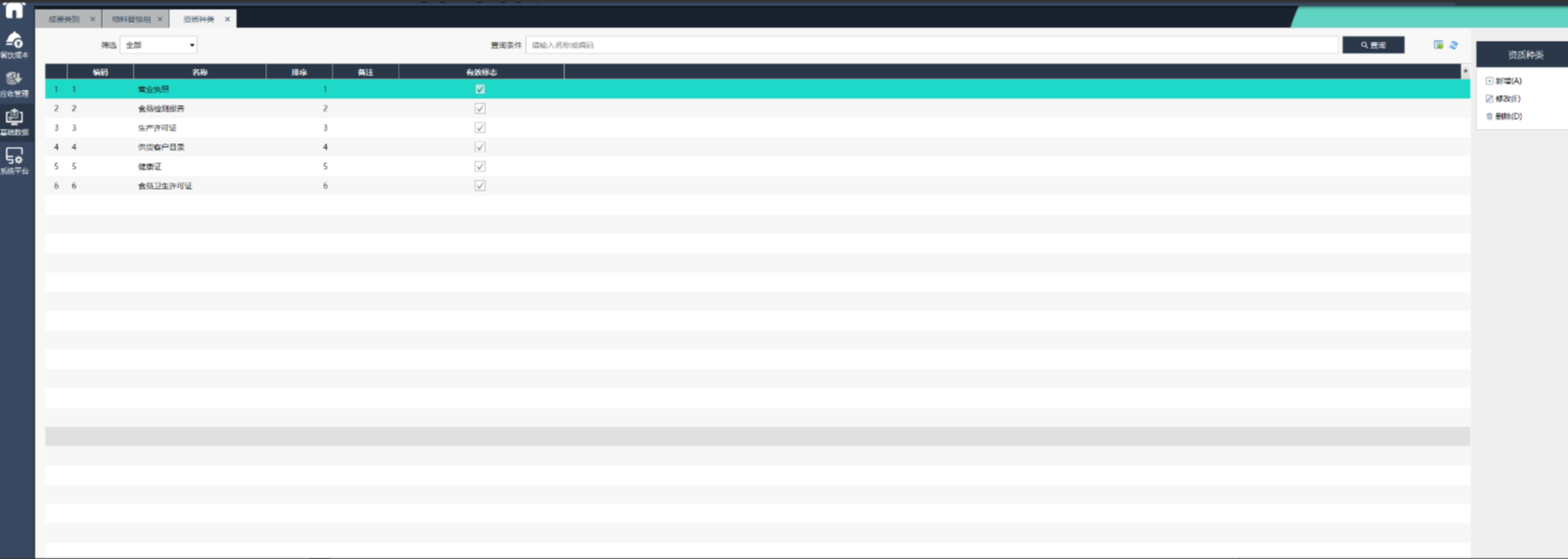 质种类指企业在不同行业当中,从事某种行业经营,应具有的资格以及与此资格相适应的质量等级标准。例:营业执照、食品检测报告、生产许可证等。用于设置企业邀请供应商成为本企业的合作供应商时,所要提供的资料信息。功能包含:新增、修改、删除。