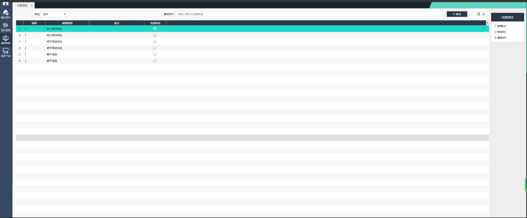 闲置原因用于描述物资被设置为闲置的原因。作用于盘存单标记物资为闲置时所需填写的原因。功能包含:新增、删除、修改。