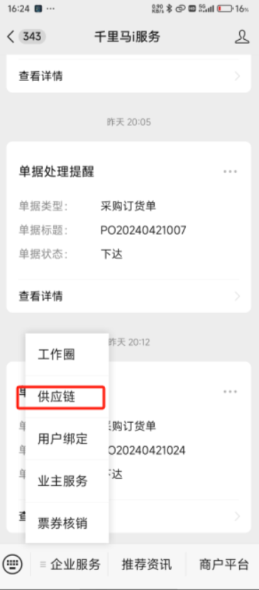 1、登录:公众号“千里马i服务”,点击菜单:供应链,点击:部门收货;