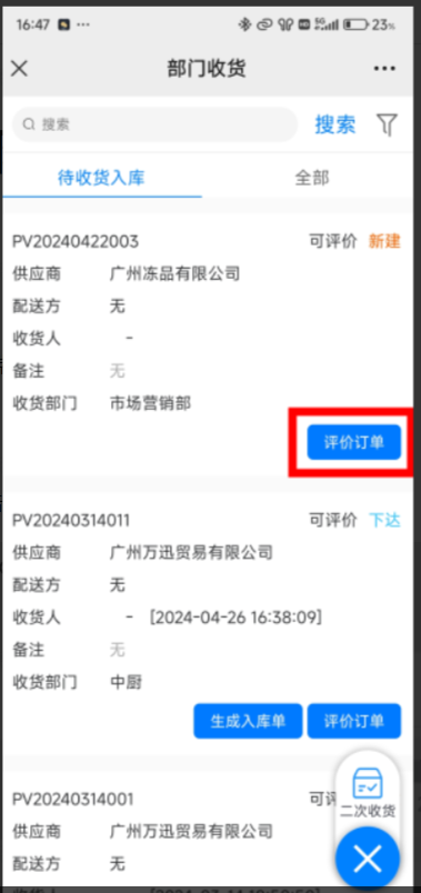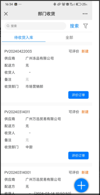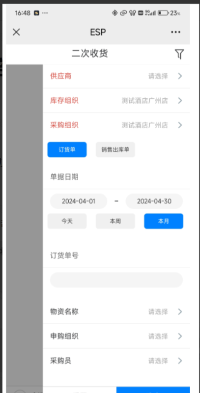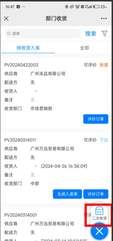 4、二次收货:点击部门收货右下角'+'号,选择二次收货,按筛选条件,定位部分收货的收货单。进行收货。