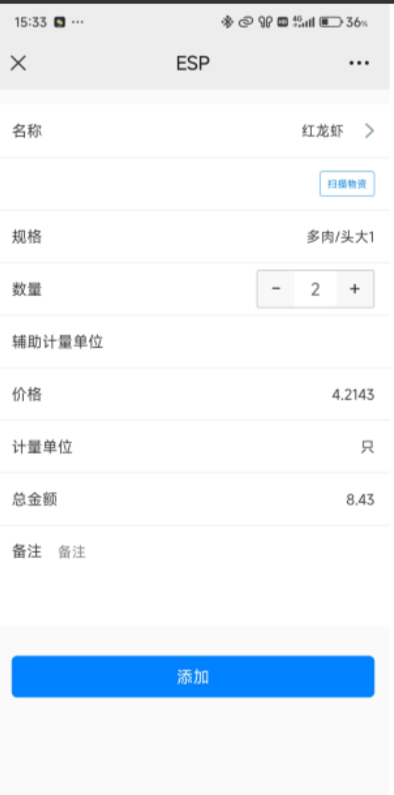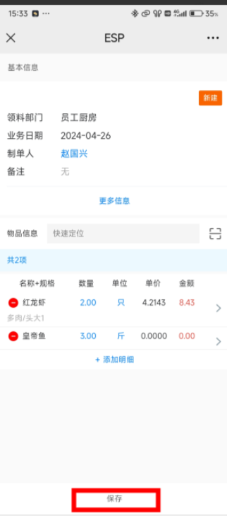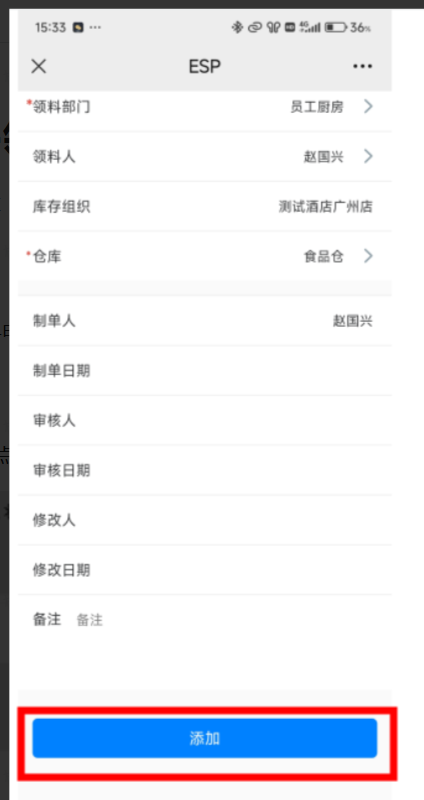 2、增加领料单、点击“+”号,填写领料部门和仓库;点击添加:增加物资明细