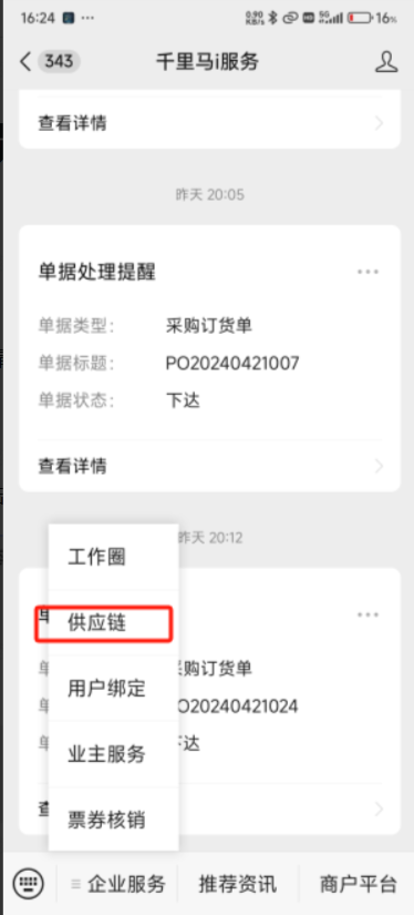 1、登录:公众号“千里马i服务”,点击菜单:供应链,选择领料申请的组织,点击:领料申请;