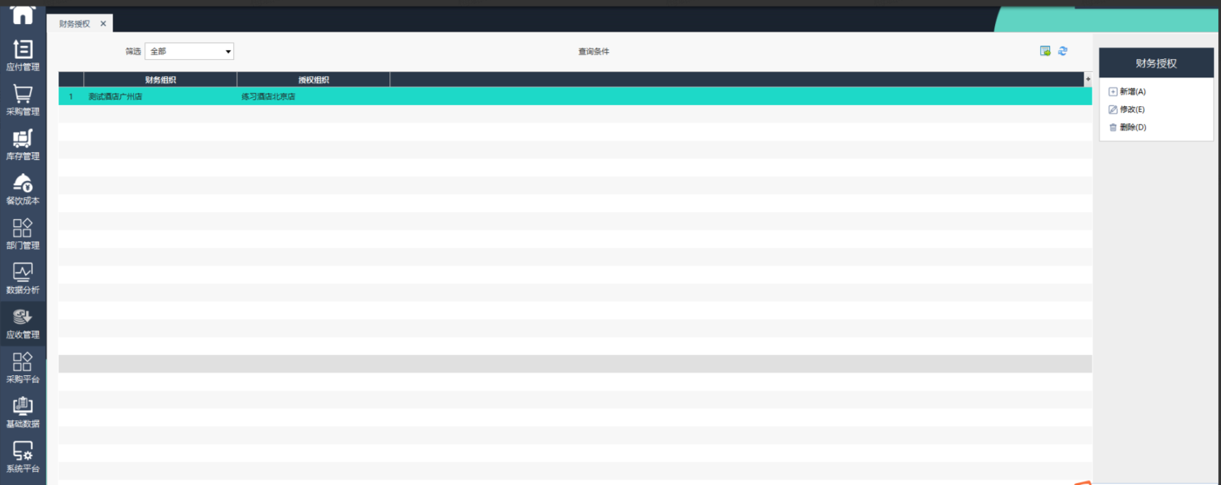 2、在集团应收组织中,将需要统一管理的门店组织添加到财务授权中。