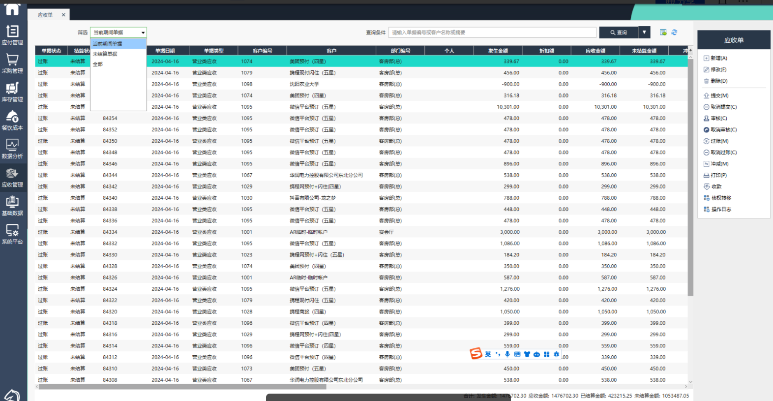 营业类应收(暂不支持):主要处理周边营业系统而产生的应收业务,例如前台、餐饮。